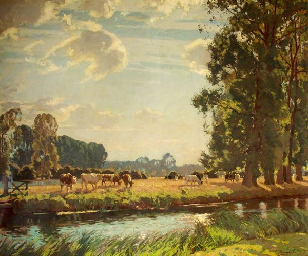 Editor: This is Algernon Talmage's "Landscape with Cattle" from 1917. It's an oil painting and it really feels like a breezy summer day, doesn't it? I love how the light filters through the trees. What do you see in it? Curator: Ah, Talmage. He captures a sort of pastoral contentment, wouldn't you say? The dappled sunlight...it almost vibrates with warmth. But look closer, what do you notice about his brushstrokes? Almost chunky in places, wouldn’t you agree? Editor: Yes! The impasto is really thick in areas, especially in the foreground. Is that typical of the Impressionists? Curator: It is, and it isn't. They each had their own language, of course. I like how the cattle almost blend into the landscape. Almost dreamlike...as if you're looking back at a hazy summer memory. You know, the Great War was still raging when this was painted. Perhaps a scene like this provided a moment of tranquility and normalcy. What do you think about that interpretation? Editor: That’s an interesting point, because it feels almost idealized. A refuge. So you think the chaos of war influenced how artists depicted the calm of nature? Curator: I wouldn't doubt it for a moment. This painting could be a love letter to the enduring beauty of the natural world, a whispered prayer for peace, or maybe just an escape for both the artist and the viewer. You see, the thing about paintings is that we find our own stories in them... like you and the breezy summer's day... Editor: That’s a lovely way to think about it! I guess what you find in art is always personal. Curator: Precisely! A conversation between the canvas and yourself.