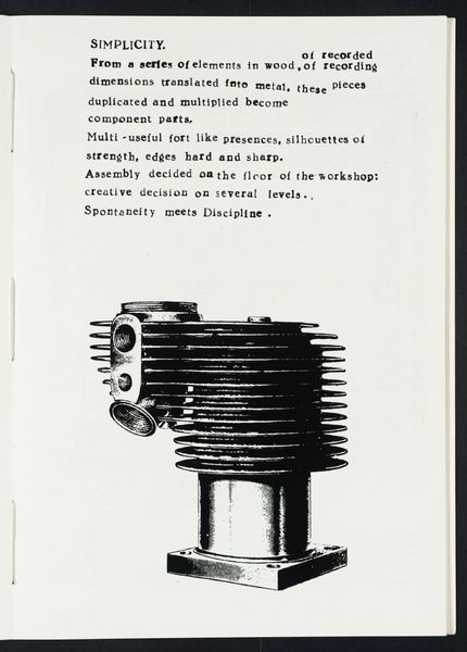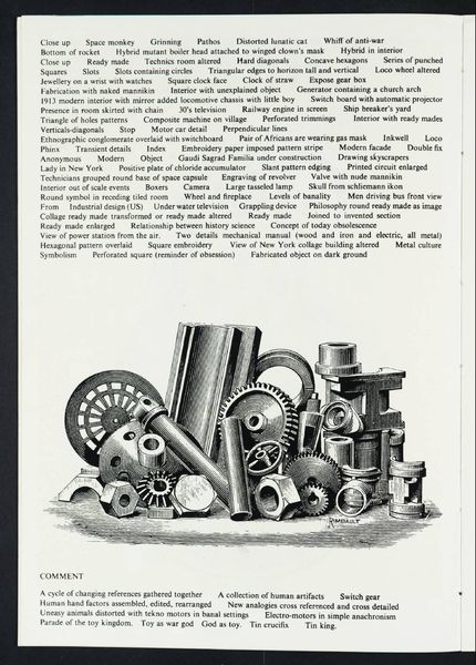 Editor: This intriguing print by Eduardo Paolozzi showcases a mechanical object with interlocking gears. The stark monochrome palette gives it a very industrial feel. What strikes you about the composition and structure of this piece? Curator: Indeed. The organization of forms demonstrates a calculated arrangement, almost a mechanical ballet. Consider the interplay between the rigid geometry of the gears and the subtly organic texture implied by the printing process. How does this tension contribute to the overall visual experience? Editor: It's a captivating contrast. The precision of the gears suggests order, while the texture hints at something less controlled. I hadn't considered that before. Curator: Precisely. And note how the title “EHRKA” is integrated as a design element, not just a label, above the mechanical drawing. Paolozzi is clearly interested in the formal qualities of text as well as image. This work reveals the power of visual elements to evoke meaning. Editor: This has made me look at the work in a completely different way. Thank you!