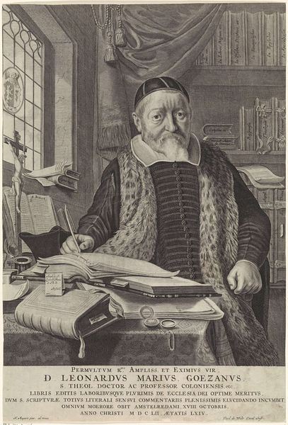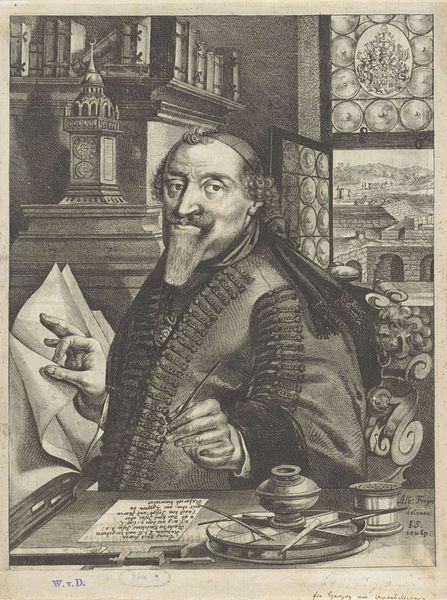 Editor: This is "The Burgomaster" by James Watson, created sometime around the late 18th century. He looks so thoughtful, almost burdened by the contents of that letter. What symbols stand out to you in this piece? Curator: Note the dried herbs or grains hung near the window. They suggest prosperity, preservation, and a connection to the land, while the Burgomaster’s introspective pose hints at a personal, perhaps moral, reckoning. Are we seeing civic duty balanced against a private life? Editor: That's fascinating! I hadn't considered the herbs in that light. Curator: Consider how Watson uses visual cues to suggest both the weight of responsibility and the enduring values of his subject’s world. What do you make of the contrast? Editor: I see how Watson connects the individual to larger cultural ideas. Thanks for pointing that out.