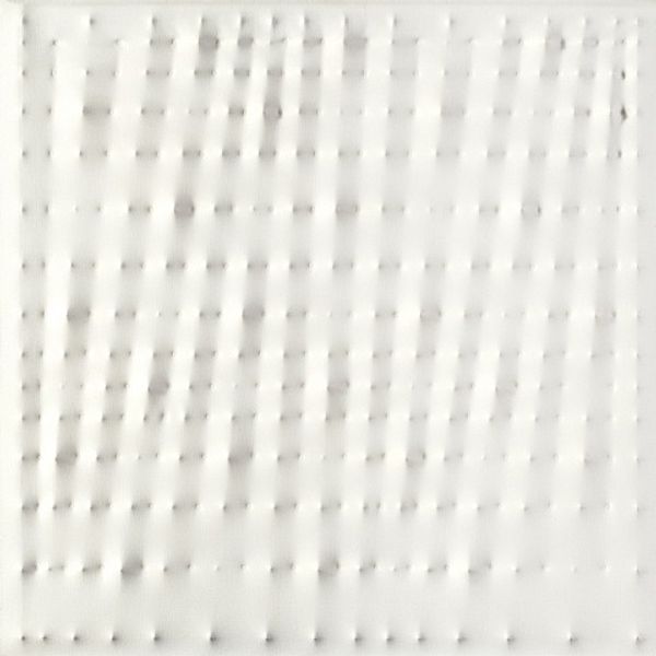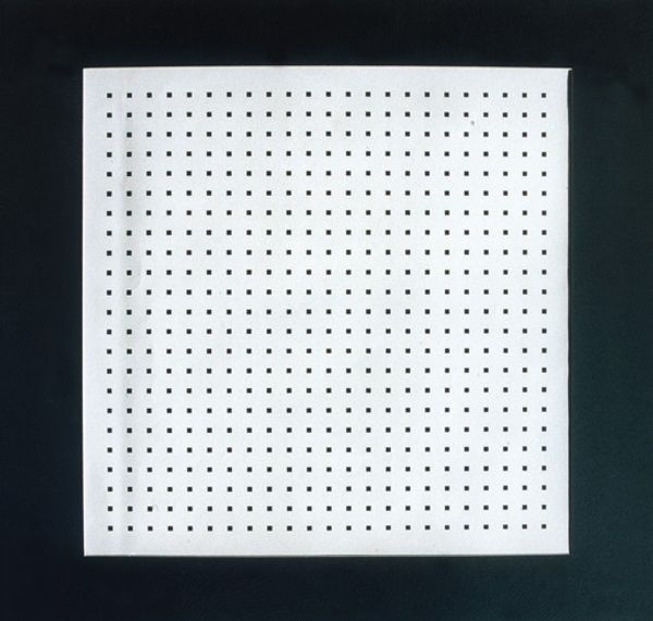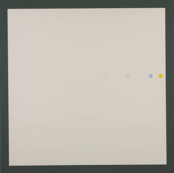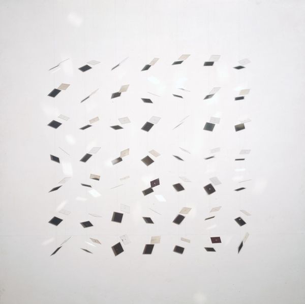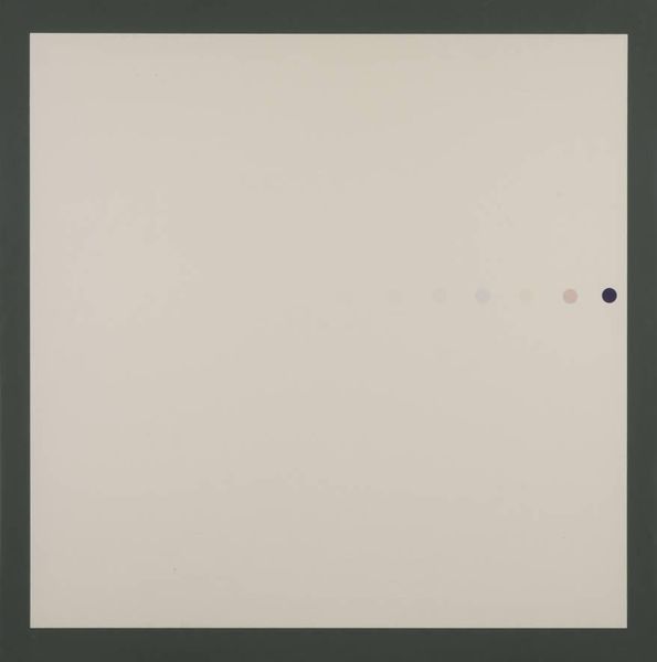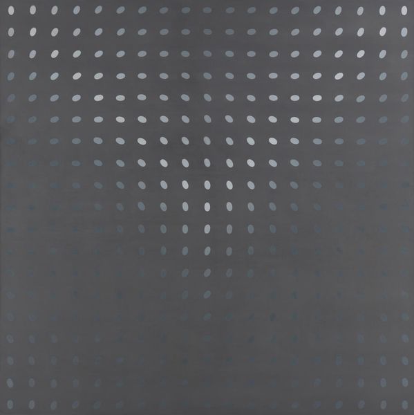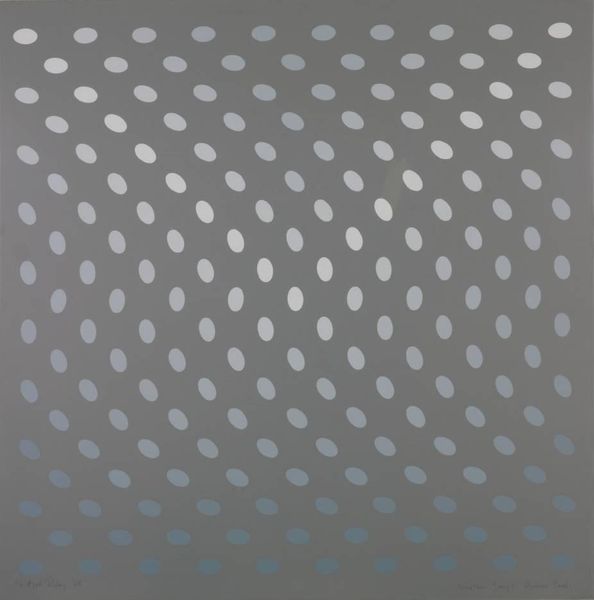 Editor: So, this is "D" by Bridget Riley. No date given, but it's in the Tate. All those shimmering dots on a blue background... It's kind of hypnotic! What do you make of it? Curator: Hypnotic is a great word! To me, Riley's work is pure sensation. It's less about representation and more about how our eyes and brains interpret patterns. I wonder, does it feel like the surface is moving? Editor: Yes, a little bit! It's subtle, but definitely not static. Is that the point, to make us question what we're seeing? Curator: Exactly! Riley is playing with perception itself. She is a magician creating optical experiences! Editor: Wow, I’ll never look at dots the same way again! Curator: Nor will I, it's like a reminder that seeing is an active, creative process.