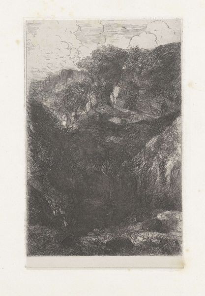 Editor: Here we have "Plate Sixteen" by François Louis Thomas Francia, from the Harvard Art Museums. It's rendered in cool blues and grays, and it feels almost like a dreamscape. What's your interpretation? Curator: Let's consider the printmaking process itself. The labor involved in creating multiple impressions shifts the focus from unique artistic genius to a potentially democratized art form. How does this affect our perception of the landscape depicted? Editor: That's interesting, I hadn't thought about how the printmaking changes the context. Curator: The materiality matters. The paper and ink—common, reproducible materials—challenge traditional notions of artistic value tied to singular, precious objects. Now, what about how that interacts with the chosen subject? Editor: I guess viewing nature through a mass-produced medium invites us to think about our relationship to consumption of resources. Curator: Precisely. A landscape, readily available to all, is rendered through a process that mimics industrial production and the increasing accessibility of art. Editor: I see, thank you for sharing.