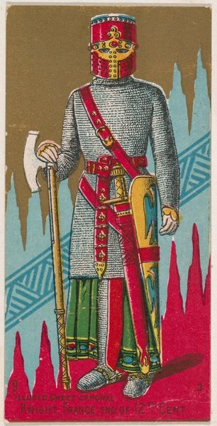 Editor: Here we have “Abyssinian Spear, from the Arms of All Nations series” created around 1887 by Allen & Ginter, held in the Metropolitan Museum of Art. It looks like a trading card! I'm immediately struck by how this feels like a snapshot of a culture frozen in time. What’s your read on this piece? Curator: Well, isn't it a curious thing, finding potent narratives in the humble form of a cigarette card? It throws us headfirst into the swirling vortex of late 19th-century Orientalism and good old fashioned advertising. You see this dignified Abyssinian warrior? He’s not just selling tobacco; he’s selling an idea of exotic lands and noble savagery – a carefully constructed fantasy, really. Editor: So, more about the West’s idea of Abyssinia than Abyssinia itself? Curator: Precisely! And notice the artistic choices - the flattened perspective, the focus on details of dress and weaponry. There's a clinical detachment, isn't there? It's less a portrait, more an ethnographic display neatly packaged for mass consumption. Makes you wonder about the original source image and how much "artistic license" was involved in its creation. What purpose did these images serve? Editor: It definitely makes me consider the power dynamics at play. I hadn't really thought about how something so seemingly innocuous could be loaded with such…baggage. Curator: Baggage indeed! It’s a reminder that even the smallest of objects can carry hefty cultural weight, prompting us to dissect the stories they whisper, and more importantly, the ones they try to conceal. And I'll never look at cigarette cards the same way!