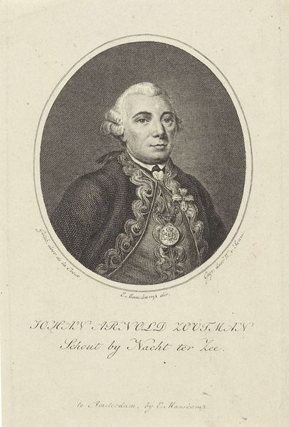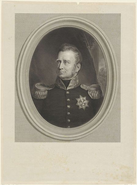 Curator: Right, let's take a look at this engraving. We're looking at a portrait of G.C.R.R. van Brienen van Ramerus, created in 1817 by Jacob Ernst Marcus. It's quite a formal piece, characteristic of the Neoclassical movement. Editor: My first impression is just how precise and somewhat stern it feels. The level of detail, particularly in the uniform, is remarkable. It gives a strong sense of authority. Like I wouldn't want to be caught making a noise in his presence. Curator: Absolutely, the precise lines of the engraving contribute to that. Consider the process of creating such a detailed image using engraving techniques; it speaks to the level of skill, time, and labor invested. We're seeing not just a likeness but a representation of status. Editor: It's interesting that you bring up the "labor" aspect, it is there embedded in every deliberate line. It also speaks of class structure, the man must have some money to get himself painted by the painter. Still, for me, there's a haunting quality to the subject's gaze, almost as if he senses the weight of history or, perhaps, the impermanence of his own power. Curator: A fascinating point, that perceived vulnerability. The print medium, in its reproducibility, allowed for the dissemination of images like these, reinforcing social hierarchies but also, potentially, undermining them through wider circulation. I mean, you'd have access to see and own such artworks. The question of access is what made these prints valuable beyond just pure decoration. Editor: It's curious how an art movement such as neoclassicism—so driven by formal order—can also unintentionally convey those hints of anxiety, mortality, and the shifting sands of influence. Also, I find it hilarious he must be tired all day wearing such big golden thingies on his shoulder! Curator: I find it captivating to consider how each line made by the hand tells not just of form but of production and distribution practices tied up with class and power dynamics within Neoclassical society. Editor: A thought-provoking work, definitely offering different perspectives. I will never not think about those things attached to his uniform, they would make a fun cat toy.