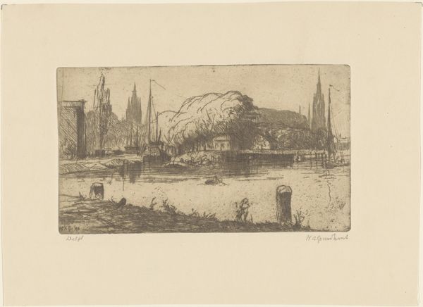 Curator: "The Jobbing District," an etching by Gustav Goetsch, dates to around the early 20th century. The scene captures a moment in Minneapolis’ industrial heart. I’d love to hear your initial take. Editor: A world in monochrome! It's a beautiful yet melancholic little dream. I’m immediately drawn to the repetition of those arches in the bridge... and that lonely horse-drawn cart trundling along. The grays are all perfectly pitched to set a quiet, wistful mood. Curator: I'm intrigued you noticed the bridge first, because it acts almost as a proscenium arch framing the city's hustle. You’ve got those rhythmic curves contrasting beautifully with the angular skyline dotted with factories and what seems to be church spires, so faith and industry are standing shoulder-to-shoulder here. It strikes me as a very clever comment on the city's development at the time. Editor: The city looks grand in the background, even romantic, veiled as it is in a gentle smog. I read this urban vignette as a story about the small figure versus the grand design – it's an exploration of labor and how individual toil contributed to building a city. Did Goetsch imbue his art with any kind of personal symbolism? Curator: What’s interesting is how Goetsch walked the line between realism and impressionism, not just in the general scene, but his technical choices. Take how he employs the etching lines here. There’s real precision in the architectural details, a pure realist touch, and a slightly hazier approach that almost hides that, like with the smoke billows... a softened, impressionistic kind of effect. Perhaps he did this deliberately to mirror a romantic notion of rapid growth in industry? Editor: The soft focus gives a universal feel. Despite the work being titled and very specifically of Minneapolis, this evokes a general sense of turn of the century development and industrial growth—very much a study in change and all that accompanies it. It’s very elegantly captured. Curator: You've pinned it, I think. It's specific and universal simultaneously. That interplay…it’s quite something. Editor: Precisely—a ghostly snapshot offering itself up as an observation and meditation all in one go.