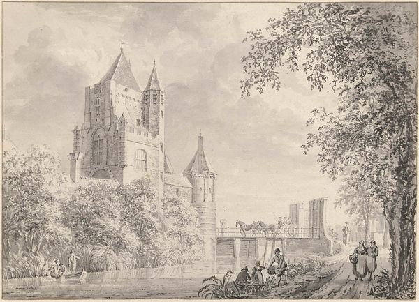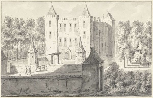 Pieter Jan van Liender created this drawing of Kasteel te Wijk bij Duurstede with pen and gray ink, and gray wash. Van Liender was working in the Netherlands during the 18th century, a time of relative peace and economic prosperity that allowed for the growth of the arts and sciences. The ruin is a picturesque scene, yet it's incomplete. It prompts us to contemplate the passage of time and the transience of human achievements. Its incompleteness invites viewers to reflect on the rise and fall of power structures, mirroring the shifting social and political landscapes of the era. The figures in the foreground, perhaps landowners or surveyors, underscore the relationship between humanity and the environment, hinting at the economic and social factors shaping the landscape. The artist captures not just the physical presence of the castle but also the emotional and historical weight it carries. It serves as a reminder that history is always present, shaping our understanding of the present and influencing our aspirations for the future.