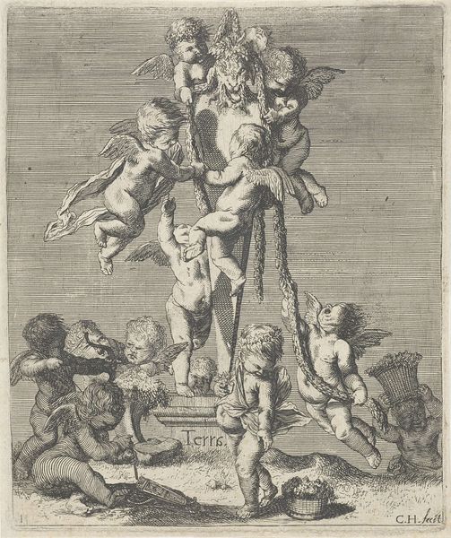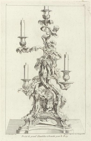 Curator: Allow me to introduce you to a design sketch, "Ontwerp voor een tweearmige girandole van porselein en goud," dating from between 1738 and 1749. It’s attributed to Gabriel Huquier. Editor: Well, my immediate reaction is “exuberant!” All those swirling, florid lines – it's the very essence of Baroque extravagance distilled into a lighting fixture. I find it almost dizzying in its ornamentation. Curator: Dizzing is a good word for it! Huquier wasn’t just imagining form. Think about what this suggests: porcelain, itself a manufactured and controlled material, combined with gold... Luxury elevated, and light – literally enlightenment! – brought to bear in a tangible way. Editor: Precisely! It screams opulence, designed, no doubt, to illuminate some noble's parlor, a testament to their refined taste, and, perhaps more overtly, to their economic power. But I wonder about the labor involved. Someone, or many someones, had to translate this intricate design into a real, functioning object. Curator: It is compelling to reflect on the labor to execute the intricate details—from the porcelain flowers coiling around the dolphin motif, to the gold accents glinting in the candlelight. But consider its deeper essence. This design proposes a conversation, doesn’t it, between nature and artifice? Those twirling, organic lines... almost as though the piece grew into being, as though it's not designed but it rather bloomed. Editor: An excellent point! But let’s also consider the market that Huquier, as a printmaker, was courting. Prints like these weren't just idle doodles. They served as promotional material, showcasing artisans' capabilities to potential patrons. Each line an investment, not just a flourish. Curator: It brings up the question: Is art about elevating daily life or emphasizing social divides? Does this object truly celebrate both? Editor: A bit of both, perhaps. It is hard to not ponder where the work exists in between human aspiration and manufactured desire. It reminds us to think of these items not as isolated artworks but parts of much bigger networks of labor, patronage, and material consumption. Curator: Indeed. Pondering this small print unveils immense networks, human hands, fiery kilns, and gilded aspirations—lighting our way to further questioning.