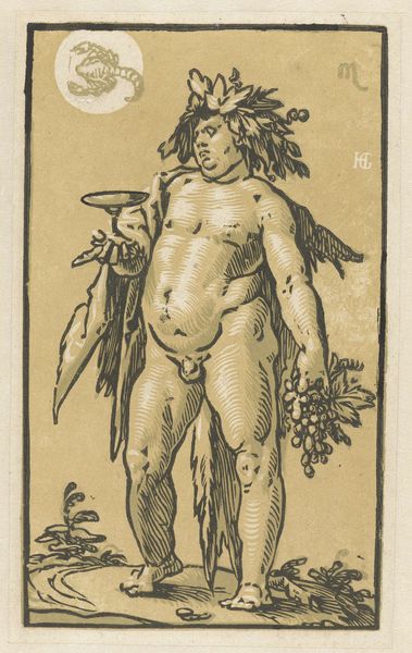 Editor: This engraving, *Putto met een leeg schild* by Sebald Beham, created sometime between 1510 and 1550, is really intriguing. The winged child has such a serious expression, especially holding that empty shield. What do you see in this piece? Curator: Well, I immediately think of the symbols of power and representation, and their perceived lack. Here we have a putto, typically representing innocence or divine love, but he's burdened by a helmet, oak leaves representing strength, and holding a blank shield. It begs the question: What is *missing* here? What story should be told on this shield, and whose story is it? Editor: That's a really interesting point! I hadn't thought of it that way, as something missing rather than simply a blank slate. So, is the emptiness intentional, suggesting a loss of something? Curator: Precisely! Think about the time this was created – a period of great religious and social upheaval. The empty shield might symbolize the uncertainty or anxiety of the era, perhaps the loss of traditional authority. The orb at his feet also carries weight, hinting at the world and the earthly responsibilities now placed upon this child. Editor: So, even a seemingly simple image like a putto can carry all this cultural memory and meaning. Curator: Absolutely. Beham uses these recognizable symbols, and then inverts our expectations, to make us consider what we *think* we know, and the underlying truths that visuals conceal. It's a potent commentary delivered through a familiar, cherubic form. What do you make of the contrast between the figure’s soft, fleshy form and the cold, hard metal of the helmet and shield? Editor: It makes me think about vulnerability versus protection…a sort of innocence versus the harshness of the world that it's forced to confront. Curator: Exactly! I learned so much just exploring the work from that perspective. Editor: Me too! It's amazing how much depth can be found in even a single engraving.