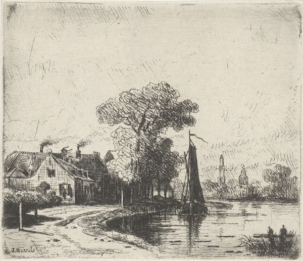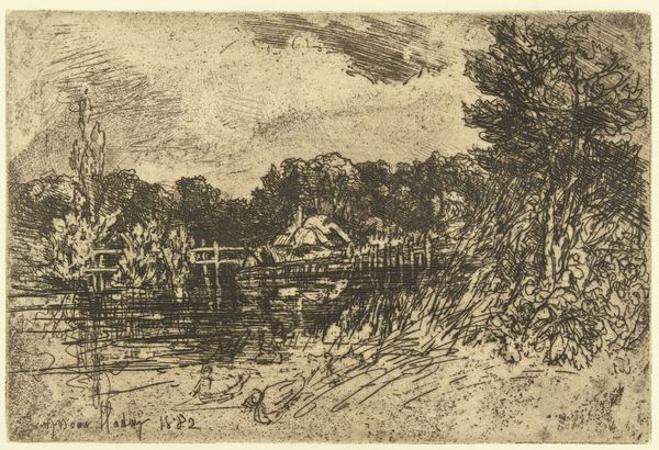 Editor: This is "Ved Fuglevad" by Louise Ravn-Hansen, made in 1898. It's an etching, and there's something so tranquil about the scene—the ducks on the water, the windmill in the distance. It feels like a snapshot of a peaceful, rural life. What do you see in this piece from a historical perspective? Curator: What strikes me is how Ravn-Hansen engages with the prevailing artistic trends of the late 19th century while subtly challenging the dominant narratives. Landscapes like this, seemingly idyllic, often served as nationalist statements, connecting the public to the land. But how might the choice of printmaking complicate this reading? Editor: I hadn't thought of that. Prints were more accessible, weren't they? Curator: Exactly. So, is Ravn-Hansen aiming for a wider audience, perhaps democratizing the landscape? Or could it be a commentary on the industrialization encroaching on rural life, with the mass-producible print mirroring the rise of mass production? Note the very precise linework achieved through the etching process and contrast with painting techniques. Editor: That's fascinating. It feels less like a celebration of nature and more like an observation, almost a study. The inclusion of the windmill now feels…less romantic. Curator: Precisely. Consider also how institutions like the SMK shaped artistic production. Ravn-Hansen, a woman artist, navigating a male-dominated art world, producing a print – how does that influence our reading of "Ved Fuglevad"? Editor: So much to unpack! I initially just saw a pretty landscape. I realize now the layers of socio-political context at play. Thank you! Curator: It highlights the complex interplay between artist, artwork, and audience. Every element is part of that historical conversation.