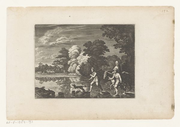 Editor: Here we have Johann Heinrich Meil's 1758 engraving, "Fable of the Dog Who Drops His Prey for His Shadow". The light and shadow are so striking, and the composition with the landscape receding into the distance feels very deliberate. What strikes you most about its visual qualities? Curator: The interplay of line and form creates a balanced composition, with the foregrounded dog serving as the focal point, meticulously detailed through the artist's controlled use of the engraving tool. Note how the formal aspects contribute to the image's overall narrative clarity. What do you make of the spatial arrangement? Editor: I notice how the landscape elements--the tower, the trees-- seem to frame the dog's dilemma in the water, creating a distinct sense of depth and separation. Is there more to glean from how the light is used? Curator: Observe how the artist uses light and shadow not just to describe form, but to heighten the dramatic effect. The stark contrast in values amplifies the sense of greed and folly exemplified by the dog, pushing him out as the key subject. Does that intentional construction influence your reading of the piece? Editor: It does. Focusing on form over content at first helped clarify the visual elements contributing to its overall narrative, like the lighting. I hadn't realized how much detail supported that thematic tension. Curator: Precisely! Through examining its formal aspects, we decode how Meil communicates that story effectively and aesthetically, wouldn't you agree?