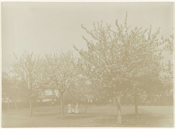Curator: This is a photograph entitled "Douglas sparren", dating from somewhere around 1900 to 1940, by Richard Tepe. It's currently held in the Rijksmuseum's collection. What jumps out at you? Editor: There's an eerie quality. It feels like a faded memory. The way the tones wash over everything gives it an almost dreamlike softness, a romanticized, almost otherworldly stillness that both attracts and slightly unsettles. Curator: Interesting. I think it pulls from the pictorialist style that was popular then, attempting to mimic painting through photography. What do you read into the image's symbols and composition? Editor: The stand of evergreen trees themselves have always been linked with resilience and immortality, the color alluding to life's continuity. In a broader sense, evergreens connect to deep ecological and mythological significance: They have an aura of perseverance through time, a testament to the cycle of growth and death, hinting at greater processes that lie outside our immediate view. The monochrome amplifies this solemn permanence. Curator: Indeed, and this aligns with the values often associated with landscape photography: a pursuit of nature, solitude, and a contemplative, aesthetic perspective. The tonal unity that emerges across the scene produces an almost graphic reduction. But that soft focus has me curious… Is it hiding something, do you think? Or is it highlighting an inner feeling evoked by the landscape? Editor: Possibly both. Photography had evolved to a point where they could alter images—manipulating elements like texture—and it looks as though this photograph uses focus, or lack of, as a gateway. Think of fairy tales or folk narratives… The monochrome aesthetic lends itself to this symbolism. They say fog obscures something hiding; perhaps it's just as often hiding itself! Curator: Absolutely. I never tire of exploring all the possible reasons and feelings one can connect to images like these. Editor: Yes, the trees certainly ask us some interesting questions about survival and visual meaning.