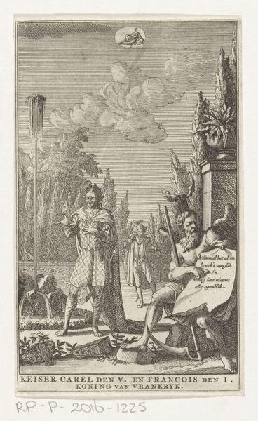 Curator: Oudry's "The Scythian Philosopher," residing here at the Harvard Art Museums, presents us with a monochromatic landscape, measuring roughly 31 by 26 centimeters. Editor: My initial impression is one of starkness, a cool emotional temperature created by the restricted palette and rather isolated figures. Curator: Oudry's focus on line and tone achieves a sense of depth that complicates the composition. Consider how the architecture in the background interacts with the foreground figures. How does this inform 18th-century French understanding of the Scythians? Editor: Perhaps it is an attempt to connect this historical narrative to a contemporary visual language. The philosophical undertones become amplified by their placement within this constructed landscape. Curator: Indeed. It prompts us to contemplate the nature of knowledge and its accessibility. Editor: Ultimately, the artwork is a testament to the power of tonal range to evoke a mood—a somber reflection on the pursuit of wisdom.