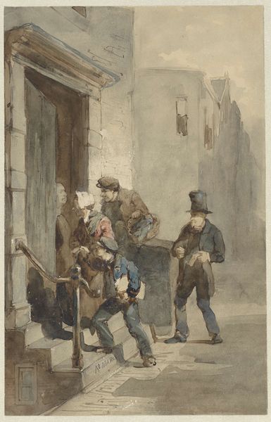 Curator: Ralph Hedley painted this genre scene in 1888. It's called "Out of Work or Nothing Doing" and the artist worked in oil on canvas to create it. Editor: My first thought? Weariness. It hangs in the very air of the painting. Look at how the fog almost obscures the buildings, just like how their futures must appear to them. The only contrast to that oppressive grey is that eager little dog! Curator: The dog is such an interesting inclusion, isn't it? Dogs have historically represented loyalty and faithfulness. One wonders if Hedley included the pup to offer some subtle glimmer of hope or perhaps to serve as a quiet commentary on these men's circumstances. After all, even this scrappy little terrier has purpose. Editor: Ooh, that reading cuts deep! I was mostly seeing it as a quirky little spark of life, that is wonderfully offset against the men's languid postures. The dog is all movement; the figures, stillness. What about the figures in the background of the piece? They are reading. Curator: The reading is an interesting detail to call out. Here, again, we might return to iconography. Books often signify knowledge, revelation, and truth. Are the foreground figures denied access to this knowledge, left only with inaction and idleness? Editor: Maybe, or they have simply logged off and taken up residence in the real world while others stay glued to their devices. Okay, sorry, couldn't resist! Looking closer, Hedley really captures their exhaustion, which probably has little to do with internet addiction, and a lot to do with, well, being out of work! Curator: Hedley himself grew up in humble circumstances, which gives this piece even greater resonance. There's empathy in every brushstroke, a subtle form of social commentary. It speaks to the cultural memory of industrial hardships. Editor: Agreed, that's really tangible, isn't it? Despite the sombre subject, there's an almost comforting camaraderie amongst them. That alone lends the work an enduring warmth. I really am struck by how topical the issues addressed in it still are today. Curator: Ultimately, "Out of Work or Nothing Doing" presents a potent reminder of how timeless the struggle for dignity and purpose remains, as immortalized by the visual symbolism employed by Hedley. Editor: Beautifully put! Makes you think about resilience, doesn't it? How these men, despite it all, found a way to simply… be. I am truly grateful for being able to ponder this picture more thoroughly.
