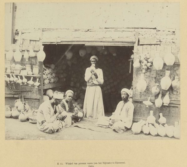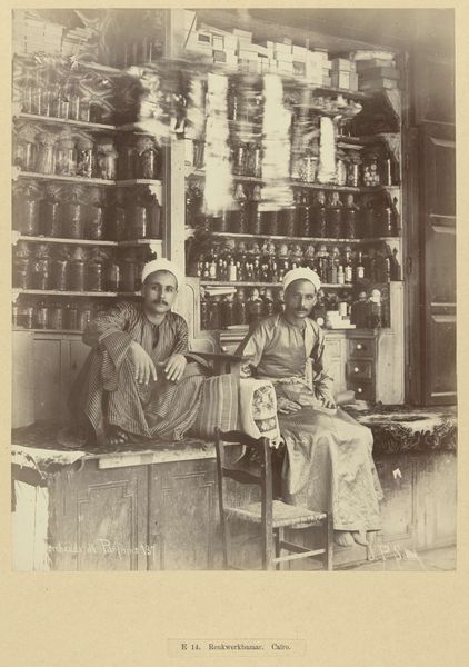 Jean Pascal Sébah captured this photograph, "Kruidenierswinkel in Caïro," sometime between 1880 and 1900. It provides us with a glimpse into the daily life and commerce of Cairo during a period of significant transformation, particularly through the lens of Orientalism that shaped European perceptions of the Middle East. The image is rich with details of a bustling grocery store, featuring merchants and a veiled woman, possibly a customer. There is a palpable tension between the intimate portrayal of everyday life and the exoticized view often imposed by Western artists on Middle Eastern subjects. Sébah, of Turkish and Armenian descent, occupied a unique position, navigating between these cultural perspectives. What does it mean for Sébah to capture this moment? Is he participating in the Orientalist narrative, or is he offering a more nuanced representation of his world? The photograph subtly challenges viewers to confront questions of identity, representation, and cultural exchange in a colonial context. It invites us to reflect on the complex layers of history, commerce, and human interaction embedded in a single frame.