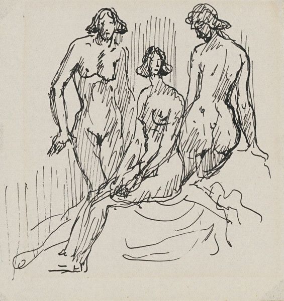 Editor: This is "Die Boxer," or "The Boxers," possibly from 1920, by Rudolf Grossman. It’s an ink drawing, and it feels very dynamic. Almost a chaotic energy with all the figures intertwined. What do you see in this piece? Curator: I see a fascinating commentary on power dynamics and the male body within the context of early 20th-century anxieties. Look at how Grossman uses line work – harsh, almost brutal – to depict these figures. They’re boxers, yes, engaged in a contest of physical strength. But consider: who are these men, really? Editor: What do you mean? Curator: Think about the historical moment. The 1920s in Germany were a period of immense social and political upheaval after World War I. There’s an argument to be made that the violence within the boxing ring acts as a microcosm of the larger societal conflicts and tensions. Notice also that all of the subjects appear to be racialized. How might this drawing speak to racist ideologies, as a German vision of people with whom he sees difference? Do you get a sense of any power imbalance in this drawing? Editor: It's true, there is an implied hierarchy... So, is Grossman critiquing violence itself, or perhaps specifically the way society allows, maybe even celebrates, displays of male aggression, particularly across racial boundaries? Curator: Exactly! And think about how Expressionism, as a style, often sought to externalize inner turmoil and anxiety. This drawing, therefore, may not just be about boxing. Perhaps, more about repressed societal forces finding expression on the page through hyper-masculine encounters. Editor: That completely changes how I see the image. I was focused on the surface, the action, but now I’m considering the historical context and underlying themes of power. Curator: And hopefully understanding art's ability to reflect—and critique—the world around it.