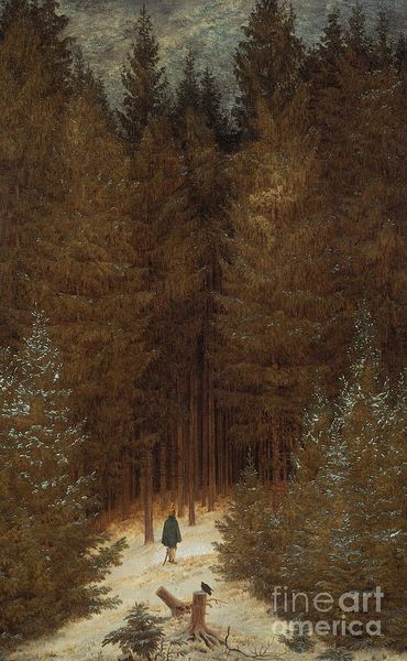 Cross in the Wilderness 2003–4 is a large oil painting by the British artist Ged Quinn depicting a gloomy woodland setting. In the background of the painting stands a substantial cluster of tall fir trees, their tips reaching towards the top of the composition, where a section of yellow-grey, clouded sky is visible. The density of the trees gives the impression that they mark the edge of a deep forest, since only blackness can be discerned between the trees’ spindly trunks. In the foreground and mid-ground is a clearing in which are depicted a miniature building and dwarfed versions of the trees in the background. The building, which is a small-scale representation of Spandau Prison in Berlin, is surrounded by a mass of barbed wire that extends outwards from the prison in all directions across the clearing, linking the foreground to the forest by means of its spiky trail. The work is extremely large and detailed, and is painted in a figurative style. However, despite the detail and realism of the representation, there is a fantastical element to the painting that is evoked by the miniature scale of the prison and the curling, foliage-like appearance of the barbed wire, which seems to grow from the ground.