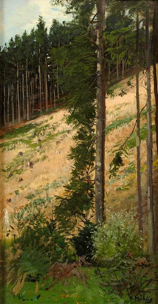 Editor: So, this is Ged Quinn’s "Cross in the Wilderness." It's a large painting, but the somber palette and dense forest evoke a feeling of claustrophobia. What stands out to you formally? Curator: The composition presents a stark contrast. The verticality of the closely packed trees is disrupted by the horizontal plane of the deforested foreground. Notice how the artist manipulates light to create depth, yet simultaneously flattens the picture plane. What effect does this have, do you think? Editor: It's unsettling. The way the light catches on the cross-shaped structure amidst the felled trees creates a focal point but feels oddly artificial, staged almost. Curator: Precisely. The tension between the realistic depiction and the symbolic form invites a deeper reading. The material qualities, the brushstrokes themselves, contribute to this feeling of unease. Editor: I hadn't considered the texture adding to the emotion. Thanks for pointing that out.
