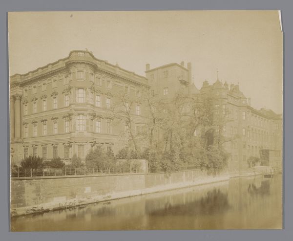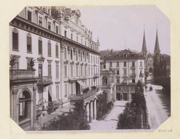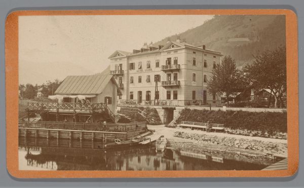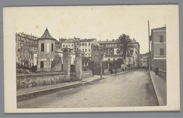 Curator: This is a gelatin-silver print by František Fridrich, titled "Gezicht op Karlsbad," dating roughly from 1875 to 1890. What strikes you most upon viewing it? Editor: The subdued tones and ordered structure project a kind of melancholy optimism. I'm drawn to the tension between nature reclaiming spaces and the rigid architectural designs. Curator: The cityscape is indeed formally constructed. Note how Fridrich has meticulously framed the buildings, creating a receding rhythm with their varying heights and the orthogonals leading toward the industrial structure on the horizon. Editor: Yes, and the photograph becomes especially poignant when you consider Karlsbad's historical context. A resort town for the elite, yes, but also a place reflecting industrialization's march into leisure, with that smokestack looming as an unsettling backdrop. Curator: Precisely. Fridrich has organized the visual elements to suggest order. However, this order belies an evolving social landscape of tension between old and new, privilege and labor. Look at the small bridge in the foreground and how the street is neatly captured in line with it: he is creating clear, geometric lines in this very Realist depiction. Editor: It's a subtle critique of the status quo then, masking in picturesque aesthetics? It captures the era's anxieties, perhaps a growing working class and an aristocracy clinging to power. Curator: I believe Fridrich, through the mastery of composition and form, directs our gaze to the coexisting elements. There is a balance in representation, both a serene spa town but in an industrializing state. Editor: A balanced portrayal it might be, but that does not strip the photograph of its powerful implications. Thank you for calling my attention to the mastery of the construction within the photograph, it further exposes this town stuck between its identities. Curator: And you brought new attention to its potent contextual meanings! This nuanced exchange exemplifies why art history matters.