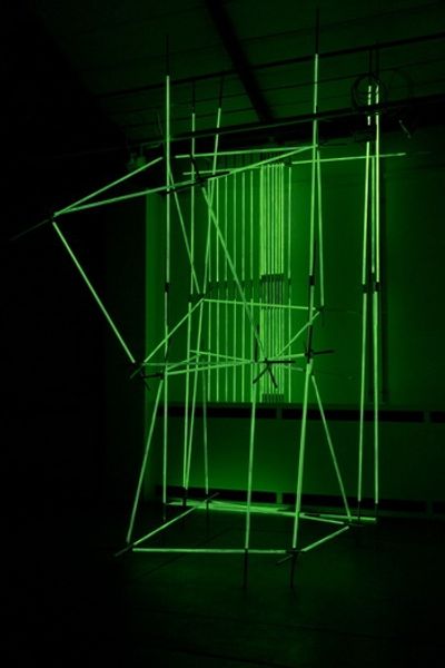 Editor: This striking installation, "Néon dans l’espace," or "Neon in Space," by François Morellet, dating from 1963, uses neon lighting to create geometric forms. Its bright, almost ethereal quality makes me wonder—what exactly is it communicating? What symbols are at play here? Curator: I find this piece intriguing because of how it distills geometry into pure, radiant form. It's more than just minimalist sculpture; the neon itself is loaded. Think about neon—it signifies modernity, the city at night, a kind of electric promise, especially prominent in 1960s consumer culture. Does the starkness of its geometric forms speak to the cool, detached aesthetic of the era? Editor: I see what you mean. There’s a contrast there. The harshness of the lines mixed with that glow almost feels retro-futuristic. The 1960s saw the peak of this Space Age fascination. Does the use of geometric shapes link to other symbols or values? Curator: Geometric forms like squares and triangles often stand for stability, order, and even intellectual pursuits. But in this dynamic arrangement, that rigidness is subverted. It seems as though these perfect shapes are imploding or exploding, implying that society, too, might be coming undone. In your mind, is there a sense of optimism or impending threat within the sculpture? Editor: That is interesting. It definitely makes me think of how abstraction can symbolize more than meets the eye; how shapes can carry just as much cultural weight as the representation of real people or things. Curator: Precisely. These elementary shapes can still hold culturally significant meanings that reflect on both past hopes and present fears. That makes this simple assemblage strangely evocative, even now.