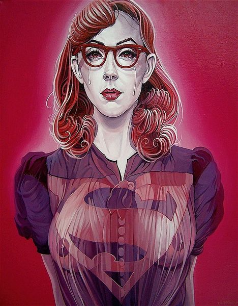 Curator: At first glance, I see a character study bathed in enigma—a young woman poised against a desolate backdrop, drawing my attention immediately. Editor: Yes, it evokes a disquieting tranquility, doesn't it? The color palette is so deliberate, that saturated red against the somber greys and blues—it speaks to both innocence and something much darker lurking beneath. Curator: The piece, titled "Audrey" by Sarah Joncas, presents a hyperrealistic portrait. The figure seems self-assured, but in a very specific context. We need to discuss this. The "Welcome to Twin Peaks" sign. The smoke mirroring a particular iconic cumulus cloud. It demands a deeper interrogation into the complex roles that women play in media, art, and our collective unconscious. Editor: Ah, but see how cleverly Joncas layers signs and symbols? The cigarette, a visual shorthand for rebellion and introspection; the red sweater, perhaps a signal of repressed passion or danger. Note the way she's posed: demure but subtly defiant, hands clasped, a knowing look on her face, drawing from this long tradition of presenting the femme fatale in popular imagination. The trees almost become spires, reaching to the sky. This feels as though there's a connection here to spiritual iconography. Curator: Right, and it raises crucial questions about agency and performance, wouldn’t you say? Audrey as a character is forced to navigate her reality as a function of performance within pre-established frameworks of patriarchy, class and respectability in American suburbia. Editor: Absolutely, it speaks to those frameworks. And it's through the skillful arrangement of these recurring symbols—the plaid skirt reminiscent of school uniforms, the looming evergreens hinting at hidden dangers in an Edenic setting—that Joncas conjures up a narrative tension that is uniquely her own and yet immediately accessible to anyone familiar with similar symbol patterns. Curator: I find it an urgent portrait about female representation in modern media, its echoes are powerful. Joncas seems to have set Audrey free within the visual paradigm and invited the viewer to engage with this liberation. Editor: An incredibly deft use of iconography and skillful composition have me convinced of that as well! It's that juxtaposition that keeps bringing me back to it. Curator: Indeed, let’s hope our audience can spend some time considering all that is offered here.