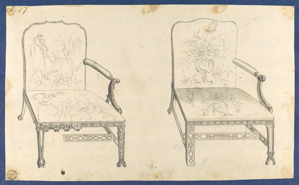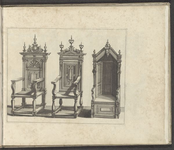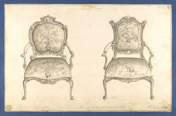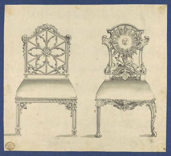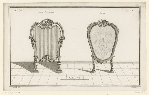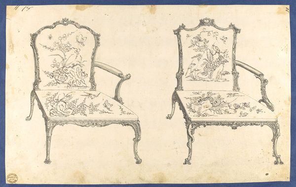 Editor: This is "Hall Chairs, in Chippendale Drawings, Vol. I," created around 1762 by Thomas Chippendale. It's a print that features three different chair designs. They all look incredibly ornate, almost theatrical. How do you interpret these designs in their historical context? Curator: Seeing these designs, I'm struck by how they reflect the rococo period's embrace of elaborate ornamentation as a statement of power and status. Chairs like these weren't just functional; they were potent symbols. Consider, who would have sat in them and what conversations would they have overheard? Editor: It's interesting to think of the chairs as witnesses. So, the level of detail then becomes a sort of visual language, communicating specific messages about the owner? Curator: Precisely. Think about the political climate of the time. These chairs were likely commissioned by individuals keen to align themselves with the dominant social and political narratives. The craftsmanship and the imported materials are all part of that declaration. It also raises questions of access. Who had the means to acquire such pieces, and whose labor was exploited to produce them? Editor: So the beauty, while visually appealing, is tied to issues of social stratification and power? Curator: Absolutely. Even the act of sitting embodies power dynamics. Who sits, who stands, who kneels? The chair becomes a stage for social performance, a quiet enforcer of societal norms. Editor: That shifts my understanding quite a bit. I initially saw them as just pretty drawings of furniture. Curator: That's the power of considering art through a critical lens! By questioning the circumstances surrounding its creation and use, we uncover hidden layers of meaning and expose the complex relationships between aesthetics and social structures. Editor: Thanks! I’ll definitely think differently about decorative arts from now on. Curator: Likewise, your observations remind us of the continuing need to make sure critical thinking accompanies aesthetic enjoyment.
