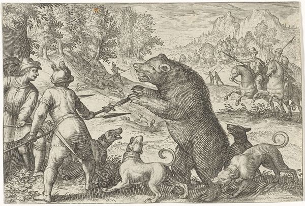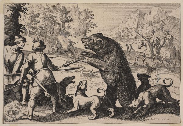 Curator: Antonio Tempesta’s etching, “Men on Foot and Dogs Fighting a Bear,” plunges us into a brutal hunt scene. What strikes you immediately about this dense, chaotic composition? Editor: The sheer ferocity! The bear, dogs, and men are locked in a life-or-death struggle. It is a primal scene with the bear at the center. Curator: Indeed. These staged hunts were popular entertainment, reflecting societal hierarchies and power dynamics. The spectacle of humans dominating nature reinforced their perceived superiority. Editor: I see the bear as a symbol of untamed wilderness—its defiance against these armed men becomes a potent visual metaphor for resistance against oppression. Think about how the bear has been culturally seen as an emblem of power, but here it is challenged. Curator: A fascinating point! I am struck by the contrast between the figures. The artist shows the power of the social hierarchy via humans versus animals, and landowners versus the untamed wilderness. Editor: Considering it, Tempesta’s image becomes a historical artifact, encapsulating complex themes of power, control, and resistance through enduring symbols. Curator: It offers so much on the relationship between nature and culture, and the staging of dominance. Editor: Absolutely. A powerful snapshot of an era grappling with its own values and fears.