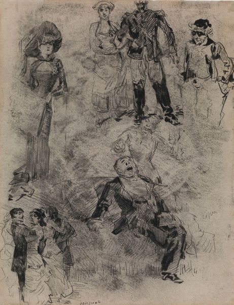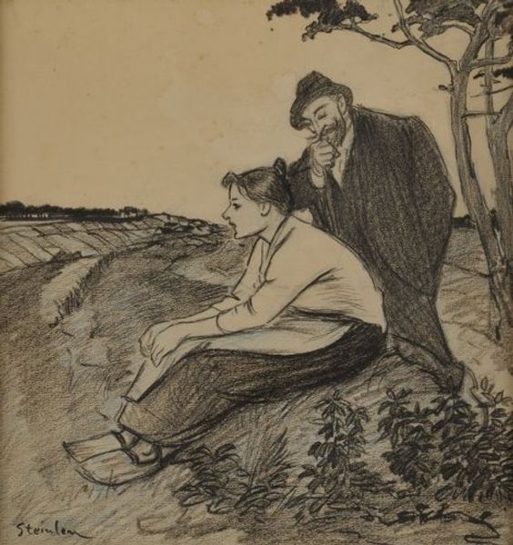 Curator: This piece is entitled "Boy and Girl," attributed to Harrison Fisher and dated 1908. It appears to be charcoal and wash on paper, though perhaps it flirts with pastel, too. The figures have a certain looseness and ease of execution that I find refreshing. What is your impression? Editor: My initial sense is of hushed anticipation. The muted colors and almost unfinished quality lend an air of secrecy, like a stolen moment. The tree acts as a symbolic barrier and a place for confessions of affection or… perhaps setting the rules for how childhood should unfold, or rather stay at bay from the perils of adulthood? Curator: Yes, the tree! So central, acting almost as a silent witness, doesn’t it? Trees are such potent symbols of rootedness and growth. I see something very American here, a nostalgic look back at a perhaps idealized moment of childhood innocence within a particular social strata. Fisher’s work certainly found popularity among those keen to reproduce an image of themselves through material objects, paintings, photographs, garments, interiors. Editor: I agree. I find it interesting how Fisher has rendered the girl's gaze averted, almost shy, yet self-possessed. There's a subtle psychological interplay at work. Do you think there is a nod to classical tropes? Fisher gained popularity because he produced an aura, an affect, which had historical grounds… he was repeating but doing something novel too, wouldn’t you say? Curator: Definitely. There are echoes of Renaissance compositions, perhaps a hint of Botticelli in the girl’s features. And his figures occupy this space of performative Americana, drawing on ideals around childhood and innocence but packaged for a burgeoning consumer culture. But this era marks also anxieties around immigration and social mobility. The artist offered audiences aspirational yet legible icons through accessible media outlets. Editor: Seeing Fisher navigate such a complex tapestry of history, commercial viability, and individual narratives helps reveal so much about America’s negotiation of childhood and memory at the start of the twentieth century. These are images we think we know and understand but carry powerful and very coded historical arguments that go beyond the canvas. Curator: A really illuminating viewpoint. And perhaps this dialogue opens our eyes to fresh interpretive pathways, too!