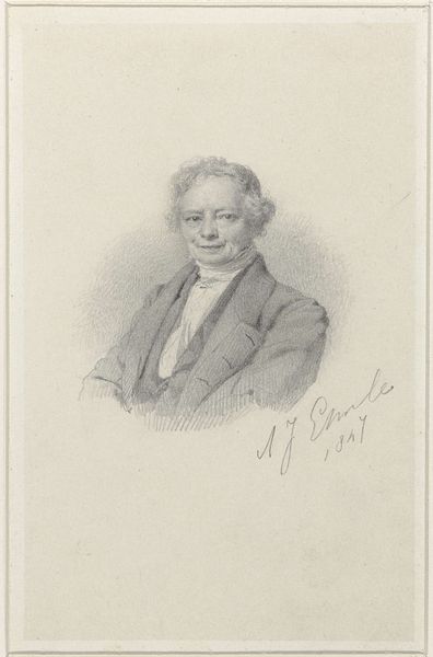 Curator: This is a self-portrait by Abraham Lion Zeelander, created sometime between 1799 and 1856. The medium is graphite, and it is a very fine drawing, almost like a silverpoint. Editor: The effect is immediately striking. It’s delicate but strong. There is such careful, concise work with the pencil. The slight asymmetry gives the face a humane, vulnerable quality. Curator: Zeelander was working in a society undergoing significant transformation, with evolving social roles and class structures. His portrait reflects this complexity. Editor: Observe how the structural logic works—the precise rendering of form—is undeniable. From the subtly shaded brow to the faint suggestion of collar and jacket, the form emerges through carefully considered marks, through contrast and variation in texture. Curator: Indeed. Consider the implications of him representing himself at a time when social mobility was increasing. Was he aligning himself with the rising bourgeois or asserting a different kind of identity? The work is fascinating on these terms alone. Editor: Beyond that context, though, let's acknowledge the formal brilliance, especially within such narrow chromatic limits! Think of the structural principles. The curly hair and clothes surround a more simply rendered face. All the lines focus attention on that still, somewhat melancholic gaze. Curator: We should acknowledge the practical aspects too. A pencil sketch would be quicker and more affordable than a painted portrait, making self-representation accessible to a broader range of individuals and classes. Editor: Fair enough. It seems his choice of medium was more deliberate than just cost-effectiveness. I also can't ignore how much expression is wrung out of the most humble, available materials. Curator: Absolutely, it’s not just about aesthetics or availability, it is also about understanding and self-reflection—creating meaning. Editor: So in the end we both can see this drawing manages to be both introspective and analytical. It's a document but also a highly constructed artistic achievement.