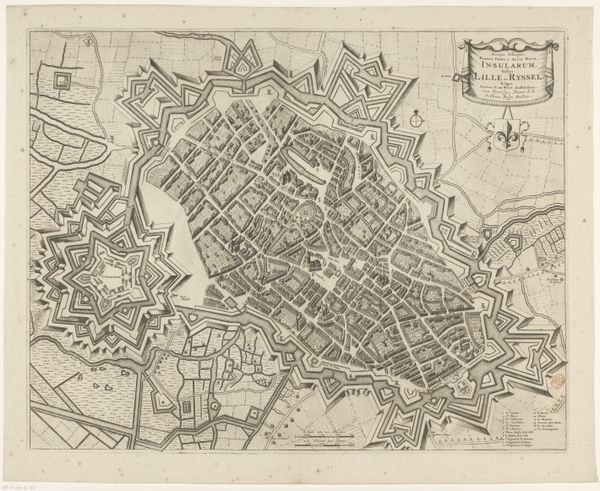 Curator: This is an intriguing piece: "Plattegrond van Ieper," or "Map of Ypres," a drawing and print rendered in ink and engraving. Although made anonymously, it is believed to have been created sometime between 1657 and 1728. What are your first thoughts? Editor: A visually dense composition. The strong lines of the fortifications surrounding what seems to be a rather vulnerable cluster of buildings… the almost obsessive level of detail, yet remaining monochrome! Curator: Indeed, notice how the city is depicted from a bird’s-eye view. We see this perspective utilized quite often in the mapping and planning of cities. You can follow the intricate road networks and prominent buildings within the city walls. What does the interplay of material processes tell us? Editor: Well, the medium itself, the use of ink and engraving suggests a functional object meant for dissemination. Consider the labor invested: The engraver meticulously translates the mapmaker’s survey into reproducible form—possibly even copied and redistributed. There's social utility built into the materials! Curator: And structurally, observe the deliberate contrast between the organic irregularity of the inner city against the rigid, almost geometric precision of its defensive architecture. The bastions extending outwards at precise angles are key. Editor: Those geometries reflect function: protection. Yet, it’s interesting how the aesthetic and defensive concerns are integrated. Those sharp points extending into the landscape, they carve into nature as much as defend against invasion. A relationship of dominion between urban space and nature… fascinating. Curator: Also notice the scale! This isn’t just art for art's sake; this provides actionable intel for citizens, rulers, or invading armies, perhaps, a form of knowledge production in itself. It’s all rather fascinating to reflect upon the myriad levels upon which its utility lies. Editor: Agreed, a deceptively rich visual document of the tensions inherent to city building, defense, and power. Makes you wonder about the stories within. Curator: I’m also interested to reflect on the tension it presents; between a supposed comprehensive view and the inherent subjectivity present in deciding what features to omit, prioritize and stylize, so on and so forth. Thank you, this has been insightful!