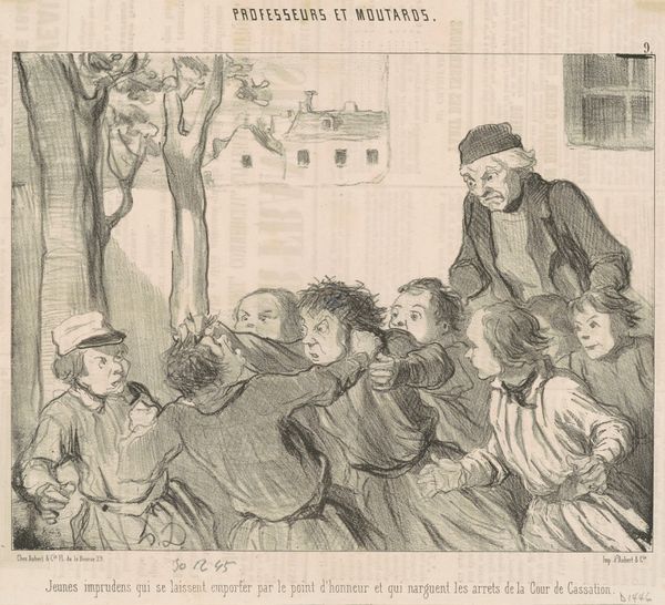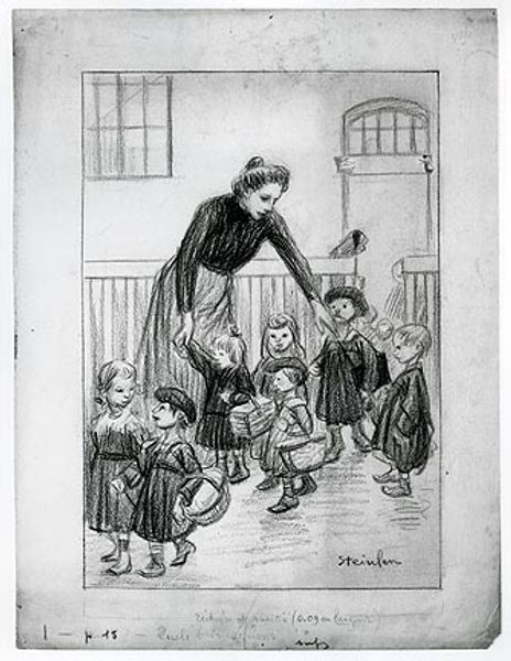 Curator: How do you approach your studies? Is it all grand theories and the artist's touch, or do you ever consider where the paint comes from, the conditions of its making? Editor: I try to think about everything, honestly! So, this piece, "A Man on a City Street, Surrounded by Children" by Théophile Alexandre Steinlen, appears to be a drawing done with pen and pencil. It's… busy. A lot of people, tightly packed, the street sketched out simply. What do you notice when you look at it? Curator: I see the means of production right there on the surface. Look at the visible texture of the paper, the rapid, almost frantic, application of the pencil and pen. It suggests a sense of urgency, of needing to document this scene quickly. It begs the question of who has the access to make such marks? Where does he purchase these materials? Who is in control of what stories are told? Editor: So, you're focusing on the *how* and the *why* of the drawing's creation? Not just the people depicted, but the act of depicting itself? Curator: Precisely! The roughness of the medium speaks to the subject matter. It's not idealized, it’s not polished. What statement is being made by showing, say, the economic divide between those children and this working man? The materiality emphasizes a specific socio-economic stratum. The 'what' is only important inasmuch as the 'how' shapes it. Editor: That's fascinating. I never considered the act of *drawing* as having a social message inherent in its… material. Curator: What do you make of the ‘Epicerie’ signage in the background? Does this work remind you of other cultural productions in history? Think back. Editor: Well, the density of the crowd and the implication of urban life feels modern… Curator: But also timeless, doesn’t it? The processes might change, but exploitation – both of labor and of resources – remains a constant in human history. Looking at a simple drawing, we can start to unpack those larger systems at play. We, as viewers, also consume images, so are therefore connected in this network. Editor: So, the materials used and the way they're applied connect directly to the social and economic conditions being portrayed. Thanks, this definitely gives me a fresh perspective.