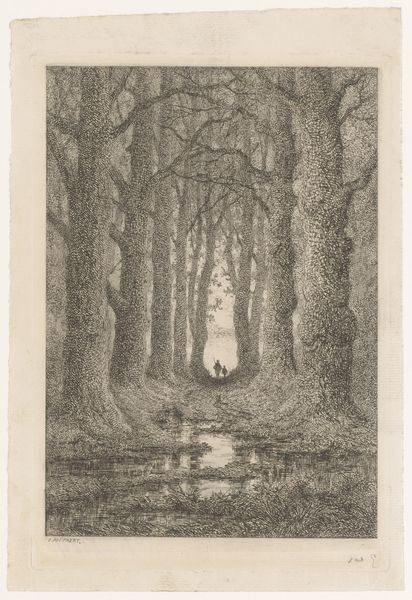 Curator: Ah, yes, Emile Puttaert's, "Twee figuren lopen met zonsondergang in het Zoniënwoud," or "Two Figures Walking at Sunset in the Sonian Forest". It’s an etching, print and drawing; dated between 1839 and 1875. Editor: Immediately striking, isn’t it? That claustrophobic feeling of the dense trees, contrasted with the luminosity on the horizon… there's such drama and yet such stark stillness. Curator: Puttaert's relationship to the wood is clearly labor intensive: all those delicate, closely-worked lines to evoke the foliage and damp earth. Look closely and you will discern that, for its time, its manufacture represents a shift toward more widely accessible art through printmaking techniques, circulating imagery and democratizing consumption. Editor: And how fascinating that the title highlights not the forest itself, but the act of walking within it. Forests in this era symbolized both the sublime and the societal constraints imposed on the people, frequently visited and depicted at that time, often inspiring romantic or revolutionary emotions. Were these figures attempting an escape, maybe a rebellion against those norms? Curator: Maybe; and think also of the availability of materials for print production, influencing choices about scale and distribution, thus directing the number and nature of viewers or collectors. It shifts away from bespoke, upper-class works. Etchings and print drawings allowed for wider dissemination; affecting artistic reputation. Editor: It makes you think, who might have owned or viewed this print? Did it reinforce a romantic vision of nature for an urban dweller, or did it spark a different sentiment? Curator: Probably different. Its reception, inevitably bound to political considerations and questions of taste at a turning point in social production practices. How should value be assigned to such skill at crafting such a piece using materials so available and affordable, so easily distributed? Editor: It does leave us contemplating the intersection of nature, representation, and societal influence during the artist's time. Thank you for your view on the artist’s manufacturing context! Curator: Indeed. Thank you; my reflections on labor and its socioeconomic context offers yet another facet.