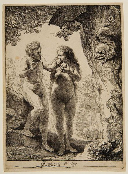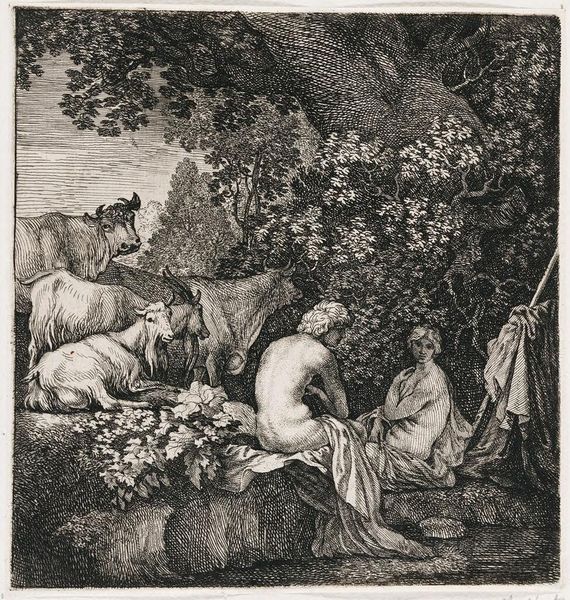 Editor: This is "A Woman Bathing Seen from Behind" by Moyses van Uyttenbroeck. It's a tiny etching, only a few inches big, yet so detailed. I'm struck by the contrast between the dark, almost oppressive foliage and the woman's luminous skin. How do you interpret this work? Curator: I feel this etching captures a fleeting, private moment. The woman, almost camouflaged by the dense landscape, is vulnerable, yet there is also a sense of her owning this space. Do you think the artist intended for us to feel like voyeurs, peeking into her world? Editor: I hadn't thought of it that way, but I see what you mean! The darkness creates a sense of secrecy. Curator: Exactly! Art's like a dream; the meaning is there, shimmering just beneath the surface. Editor: I’ll definitely remember that. Thanks for opening my eyes to new perspectives!