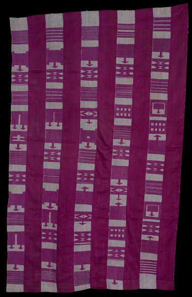 Editor: Here we have a woven textile called "-Pelete bite- lower wrapper," created by an artist of the Kalabari people around the late 19th century. It's cotton, dyed in these hypnotic geometric patterns. It feels so… order-driven, but there’s an imperfection to the dye that humanizes it. What strikes you when you look at it? Curator: Well, aren't we all seeking order in chaos? It reminds me of a fascinating dream I had once, filled with endless corridors and these same mesmerizing spirals. Beyond my subconscious, the "Pelete bite" cloths, worn by Kalabari women, were far more than mere fashion statements. Can you imagine, each geometric motif and carefully chosen color acting like a coded message, a family history whispered in cloth? Editor: Coded message? That sounds really interesting! So the pattern isn’t just decorative? Curator: Absolutely not! This lower wrapper could symbolize lineage, social standing, even trade routes and connections. Think of the weaving as their personal Wikipedia entry! But there’s something almost playfully deceptive about it, don’t you think? A Western eye might see similarities to Greek meanders, but this cloth speaks a distinctly Kalabari language. A question for you – what does the repetition do to you? Editor: The repetition? I guess it creates rhythm… almost musical? It makes me want to decode it. It’s so simple, yet so… intentional. Curator: Exactly! It invites us to look closer, to question our own perspectives. This wrapper makes me think about how art can speak volumes beyond words. I see it as a tangible record of people, a family heirloom filled with stories and histories. What did you learn? Editor: How wrong I was to think it was simply decorative. Each choice meant something specific! I learned how to “read” it, a bit, anyway.