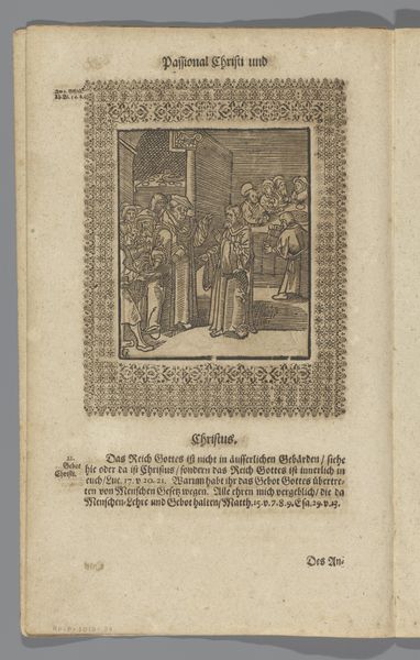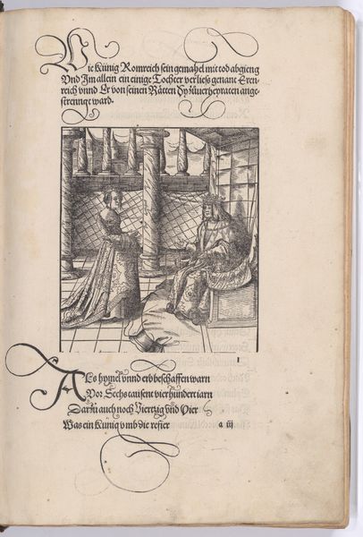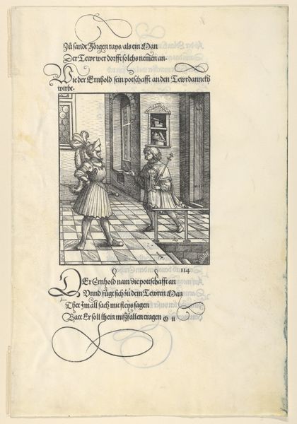 Editor: This woodcut from 1519, “[Der Theuerdank],” attributed to Melchior Pfintzing, depicts a scene with several figures inside what seems to be a castle. The monochromatic palette really highlights the lines and forms in this work. I find the composition captivating; the stark contrast makes it feel very dramatic. How do you read this image from a formal perspective? Curator: Observe how the composition is carefully structured using linear perspective and sharp contrast. The artist meticulously employed a grid-like pattern to create an image emphasizing geometric organization; the sharp vertical lines create depth, drawing our eye towards the distant building visible through the window. Notice how the formal qualities—line, space, and value contrast—create a sense of containment and narrative expectation. Editor: I see it now. It's fascinating how the lines create such an impact. Are you saying that the technique itself adds meaning? Curator: Indeed. The technical execution directly conveys an inherent logic within the constructed space, enhancing narrative clarity by orchestrating light and darkness and utilizing contrasting textures to highlight different sections. The structural integrity presented evokes narrative direction. How does that impact your experience with the image? Editor: That helps to clarify the image for me. Before I saw just shapes and a story, but now I see the skill behind the narrative. Curator: Precisely. Appreciating the deliberate structural composition transforms a mere image into an intentional expression.