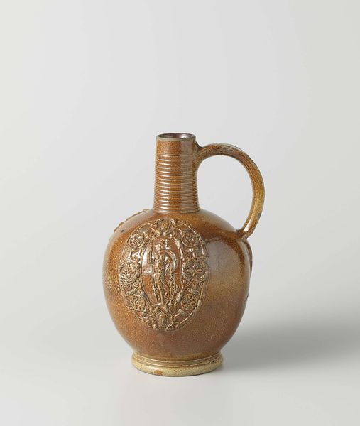 Editor: Here we have an earthenware jug by the Arnhemsche Fayencefabriek, circa 1910, adorned with a stylized floral design. I'm struck by how its earth tones seem to ground the art nouveau flourish. How do you read this piece, especially within its historical moment? Curator: Well, the decorative arts of this period were deeply intertwined with social anxieties. The Arnhemsche Fayencefabriek, like many Art Nouveau workshops, sought to democratize art by making beautiful objects accessible. However, the style’s organic forms and emphasis on handcraft also critiqued industrialization and the alienating effects of mass production. Do you see a tension in its seemingly simple presentation? Editor: I do see the tension. On one hand, the floral pattern speaks to the beauty of the natural world, and the symmetry suggests some measure of control. Curator: Exactly. And consider the rise of the middle class at this time. Pieces like this would have been aspirational, demonstrating both taste and a certain social consciousness. What do you make of the flowers and the overall color palette in terms of social signalling? Editor: The flower pattern almost looks like an owl face - they're decorative, certainly. Is the natural color scheme intended to emphasize authenticity, or perhaps connect to larger cultural movements concerned with environmentalism or spiritualism? Curator: It is fascinating to consider potential animal forms and the earthiness does tie into contemporary cultural trends towards nature. However, let's also remember this object would have been displayed in domestic settings, acting as a silent participant in shaping bourgeois identity and values. It's a celebration of nature filtered through a very specific lens. Editor: So, it's not just about beauty, but also about belonging and the complicated ways we express ourselves through objects. I never thought of a vase having so much to say. Curator: Precisely! And questioning these objects opens a window onto the broader social fabric of the time.