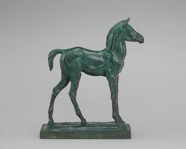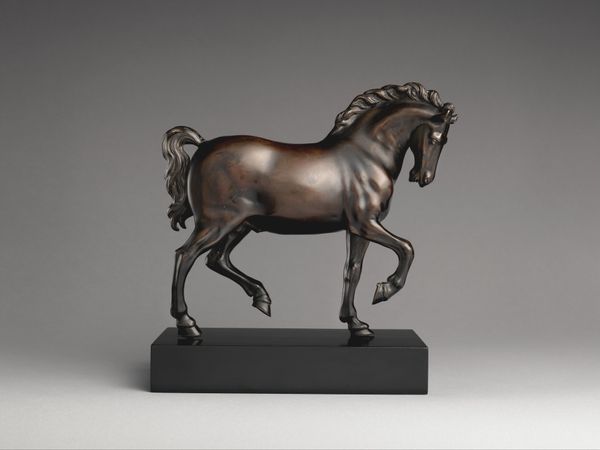 Editor: So, here we have Francesco Fanelli’s bronze sculpture, "Galloping Horse," created sometime between 1650 and 1699. It’s surprisingly small but captures this intense sense of movement. How do you interpret this work? Curator: For me, it’s vital to situate this dynamic piece within its socio-historical context. The Baroque era was a period defined by absolutism and courtly spectacle, and animals, especially horses, frequently embodied power, nobility and control. How might this sculpture be reinforcing those ideas? Editor: I suppose a powerful horse would represent the powerful person who owns it. It's definitely idealized. Do you think there's any subversion going on? Curator: That’s a very insightful question! While it reinforces certain status quo ideals, this sculpture also embodies a kind of performative masculinity that was prominent then. Think of the artist crafting this miniature bronze for wealthy patrons; they were invested in presenting a powerful image to the world, almost like a theatrical display. Does knowing this change how you see the "Galloping Horse"? Editor: Definitely. It adds a layer of... insecurity, maybe? This emphasis on power can mask vulnerabilities, as though Fanelli is commenting on these gender roles, this masculine performance. The intensity becomes less impressive and more anxious. Curator: Precisely. The scale, material, and subject of "Galloping Horse" all point to a culture deeply invested in visual signifiers of power and status, signifiers often complicated by internal tensions. It asks us to critically engage with both the historical and contemporary meanings of such representations. Editor: It’s amazing to consider how so much can be communicated, even critiqued, in a single sculpture. Curator: Exactly! The intersection of art and cultural history helps reveal these complexities, pushing us to see art as an active participant in societal discourse.