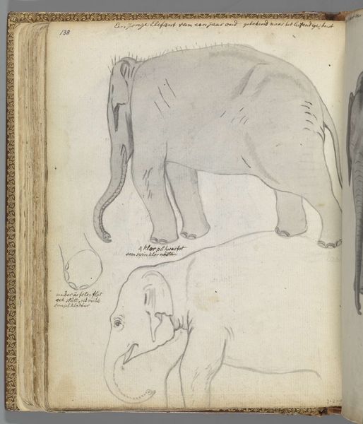 Editor: Here we have Jan Brandes' "Young Elephant by a Tree," made around 1785 using pen, pencil and watercolour. It looks like it’s straight out of a travel journal. The baby elephant has such a melancholy look! What strikes you most about this piece? Curator: You're right, there's a tenderness here, isn't there? The muted colours and aged paper evoke a real sense of time and place, transporting us to the artist's experience. And notice the elephant itself - it's carefully observed, but also slightly awkward. Perhaps the artist was trying to capture something of the elephant’s essence, beyond just its physical appearance? Editor: Awkward, yes! The elephant almost looks surprised. What about that additional drawing below it? Curator: It adds a wonderful layer, doesn't it? Like a second thought or an experiment. Brandes is showing us his process, his way of seeing. It's less about polished perfection and more about the raw act of observation, of trying to understand and connect with this creature. You almost feel like you are looking over his shoulder. Doesn’t that chained leg also conjure the ethics of travel and exploitation in that period, too? Editor: That's a great point! The chained leg certainly complicates the cuteness factor. I guess it's easy to forget the context sometimes. Curator: Precisely! Art isn’t made in a vacuum. I find it compelling how this little drawing, seemingly so simple, can open up so many avenues of thought and feeling. Editor: I completely agree. I’ll never look at a travel sketch the same way again! Thanks for making me see the bigger picture here!