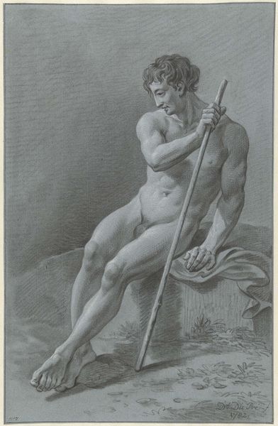 Jacob Ernst Marcus rendered this nude male figure with red chalk on paper. The composition is dominated by the man's back, which is powerfully modeled using line and shadow. His form is softly lit against the textured background, creating an almost sculptural presence. The figure’s contrapposto pose, with weight shifted onto one leg and a spear held aloft, introduces a dynamic tension. This classical reference could be seen as a play between the idealized form and the real-world anatomy Marcus meticulously captures. We see here a structure of looking that invites the viewer to decode its layers of meaning through semiotic analysis. The cross-hatching technique used to model the man's muscles and the subtle gradations of tone emphasize the body's physicality. It is this intersection of artistic form and cultural discourse that elevates the drawing beyond mere representation, inviting us to reflect on the evolving dialogue between body, art, and perception.