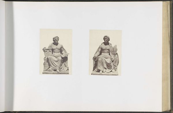 This photograph by Edouard Baldus presents plaster models for sculptures intended for the Palais du Louvre. The composition, defined by the stark contrast between the detailed models and the expansive blank space, draws our attention to the formal qualities of the sculptures themselves. On the left, "La Musique" exhibits a playful asymmetry, with instruments and cherubic figures swirling around a central form. To the right, "L'Art Assyrien" contrasts this with a stately, seated figure holding a tablet, embodying a more rigid, authoritative posture. Baldus's photograph prompts a consideration of how these models, rendered in a uniform tone, negotiate the space between original artistic creation and its photographic representation. What is revealed through the interplay between sculpture, photography, and the architectural ambition of the Louvre itself? The photograph exists not merely as documentation but as an invitation to consider the nature of artistic representation, cultural memory, and the construction of value.