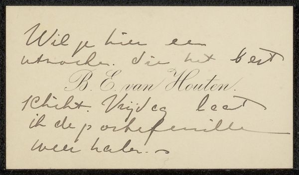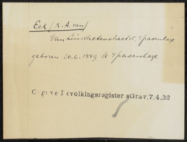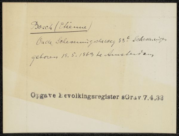 Editor: Here we have "Document betreffende Hendrikus IJkelenstam," possibly created between 1932 and 1936. It’s a simple document, ink on paper, with a handwritten script. I’m struck by how intimate and yet bureaucratic it feels at the same time. How do you interpret this work? Curator: This seemingly mundane document is deeply compelling when considered within its historical context. The neat handwriting and bureaucratic language stand in stark contrast to the tumultuous era in which it was created. The 1930s in Europe were marked by rising fascism and increasing persecution. Does the name IJkelenstam resonate with you? Editor: I can't say that it does immediately, no. Curator: This document could very well be related to someone attempting to prove their identity or origins during a time when such proof could be a matter of life and death. Consider the coded language often employed during periods of oppression and war. The seemingly innocuous details - address, date of birth, registration information - become incredibly potent signifiers. The very act of documenting becomes an act of resistance, an assertion of existence. What feelings arise knowing its potential purpose? Editor: It’s heartbreaking. The handwriting suddenly feels much heavier. Knowing that the creation of this document might have been crucial to someone's survival completely changes my perception. It highlights the power of the written word, both for oppression and for resistance. Curator: Precisely. And that tension, between the personal and the political, the official and the individual, is what makes this seemingly simple document so powerful and relevant, even today. It compels us to question the narratives we inherit and to recognize the potential for activism, resistance, and reclaiming identities that even seemingly neutral documents possess.