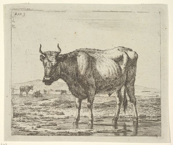 Editor: This is Christian Holm's "Standing Cow by a Watering Hole" from 1821, made with engraving. I'm struck by its simplicity; it's just a cow, but there's a quiet dignity to it. What do you see in this piece? Curator: That simplicity, I believe, speaks volumes. Cows in art, especially in the 19th century, often represent a connection to the land, a grounding in rural life. Consider this cow's placement; she is knee-deep in the water. Is that mere thirst or something deeper? Water is often used as a symbol for cleansing, regeneration. Editor: So, she is not simply standing, she could also embody the notion of rebirth. Is that an animalistic cultural trope that endures across generations? Curator: Precisely! Think of ancient myths – Europa and the bull. Even now, agrarian societies carry a sense of stewardship towards the land and cattle. The cow is sustenance, a symbol of fertility, of bounty. The animals in the background seem content as well. Editor: It’s fascinating how an everyday scene can carry such a weight of symbolic meaning, both as cultural reference and perhaps psychological insight, right? The artist decided to draw our attention to such a common creature. Curator: Indeed. And consider the medium, engraving. It allows for precise detail, realism but also creates a starkness. There’s an almost melancholic air about this image. Editor: I never thought I could look at a cow in a watering hole and see so much. Thank you! Curator: My pleasure. Sometimes the most profound meanings are hidden in plain sight, like symbols, aren’t they?