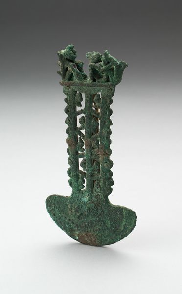 Editor: This is the Rooster weathervane, made around 1870. It’s a mixed-media sculpture, mostly metal, currently residing here at the Minneapolis Institute of Art. I find it so striking how weathered it looks! What's your interpretation of this piece? Curator: Oh, I adore this rooster! He’s so wonderfully…worn, isn’t he? A sentinel against the sky. When I look at it, I can almost hear the wind whistling around him, imagine him stubbornly pivoting in the face of storms for decades. The rooster, of course, has always been this potent symbol: vigilance, courage, even a dash of pride, strutting about. Do you think that plays into it? Editor: Absolutely. I imagine it's no accident they chose a rooster! It's seen so many sunrises! Does the patina say something too, beyond just age? Curator: The patina... it’s a layer of poetry, wouldn’t you say? It’s not just tarnish; it’s time, the slow, silent conversation between metal and atmosphere. This isn't a pristine gallery piece; it's a survivor, a testament. I love how it almost makes the metal seem… alive. Makes you wonder what he’s seen up there. What stories he could tell if he could cluck them out. Editor: I love that – the "layer of poetry." I hadn't considered that. So much history and resilience captured in one sculpture. Thanks for shedding light on its charm! Curator: My pleasure! And isn’t that what art's about – glimpsing stories where you thought there were none? Maybe next time you see one of these weathered fellows you'll remember our chat!
