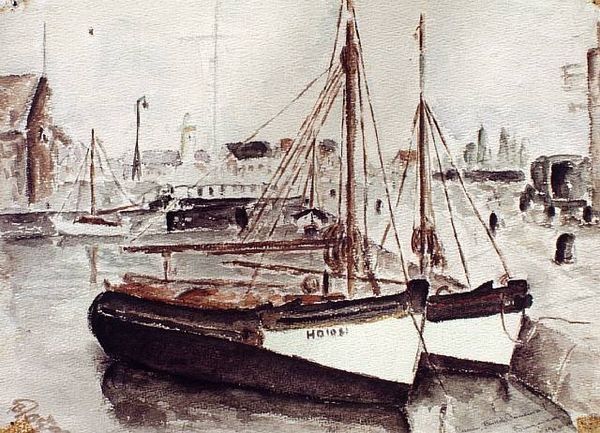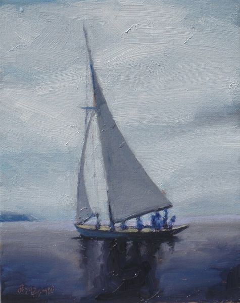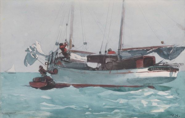 Curator: This watercolor, simply titled "Castle Wraith" by John Miller, invites a closer look with its quiet maritime scene. What springs to mind for you initially? Editor: A wisp of a memory… the ghost of a fishing boat suspended on the faintest blue. It’s so delicate, like a dream you can barely grasp before it vanishes with the sunrise. That red sail, though, sings a little louder than the rest, doesn't it? Curator: It does! It provides a crucial focal point in an otherwise muted palette. Thinking about John Miller, landscape and genre-painting are clearly at play here, and given the "wraith" in the title, it makes me wonder if the image seeks to represent the very ethereal character of this ship and perhaps hint at what it represents in the collective consciousness of sailors and seafarers, broadly speaking. Editor: A phantom vessel adrift in a sea of impressions. The brushstrokes are so loose, almost hurried, conveying a sense of transience. Perhaps that vivid red is there to anchor it, to keep the memory afloat a bit longer, a defiant flag against the encroaching nothingness. Did the artist intend this vagueness? The human figures, I notice, seem small and almost like shadows... Curator: Shadowy indeed, lost as they are among the many tasks and functions they're required to carry out on that very vessel, day in, day out. The effect underscores their anonymity and insignificance versus the broader context. This, of course, ties to long-held historical power dynamics related to working conditions on boats just like this one. As for intentionality, John Miller leaves this beautifully open to our projections. Editor: So we project onto its canvas our fears and desires? This sea feels infinite precisely because it’s unknowable. It reflects, perhaps, what is not said but acutely felt and understood between seafarers themselves... a wordless sense of dread and uncertainty in the face of nature's grandeur. Curator: Absolutely! It's about harnessing emotion and collective historical experience, and transcribing all this into the visual field of art in such ways that a whole new visual lexicon is made legible and felt. Editor: Well, that gives me a different type of shiver. So next time you find yourself out on the sea and someone talks about wraiths, listen. Curator: Definitely! It can carry profound insight. Thank you for joining me as we peered into its spectral seas.