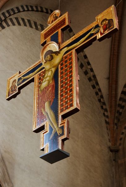 This is a painted crucifix made by Luca di Tommè around the 14th century. It’s made with tempera on wood, a traditional technique for the time. Think about how the artist used the wood's surface, its grain and texture, to create the artwork. The wood isn't just a passive support, it's an active participant in the making process. The work involved in preparing the surface, applying the gesso, and then carefully painting with tempera, would have been considerable. The cross is embellished with gold leaf, a luxury material that adds to its visual impact and symbolic value. Consider the social and cultural context in which this work was made. In the medieval period, the production of art was often a collaborative effort, with artists working in workshops. A work like this speaks to a network of skilled labour and a deep understanding of materials, blurring any line we might draw between art, craft, and industry. The value of this piece comes not only from its religious meaning, but from the labor and the accumulated knowledge that went into its creation.