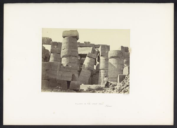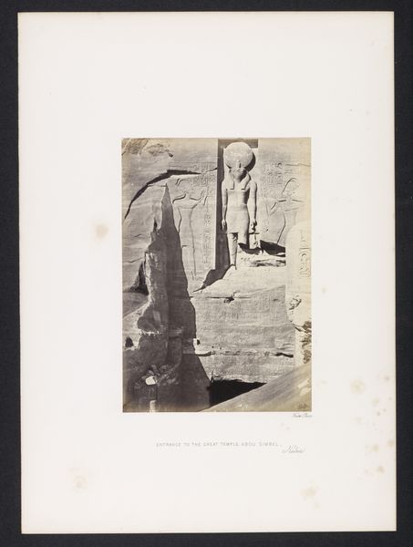 Editor: This gelatin-silver print captures the façade of the temple at Abu Simbel, taken by Francis Frith before 1859. It’s incredible how this early photograph almost flattens the immense scale of the statues, yet you can still sense their imposing presence. What aspects of this piece do you find most compelling? Curator: I'm immediately drawn to the photographic process itself. Frith had to transport heavy equipment across vast distances to document this monument. It’s important to understand the labor involved, not just in the original carving of the temple, but in its 19th-century rediscovery and documentation. What materials and logistical challenges do you think Frith faced? Editor: I imagine just developing the plates in the heat would have been a huge undertaking! And the chemicals… So, you see this image as much about the making of the *photograph* as about the temple itself? Curator: Absolutely. Consider the social context as well. This photograph was created during a period of intense European interest in Egypt. It reflects the colonial gaze and the desire to possess and understand other cultures through documentation. We need to think critically about whose story is being told, and how. Is this photograph truly representing ancient Egyptian power, or is it serving a different agenda entirely? Editor: So the photograph itself becomes a kind of commodity, bringing the image of Abu Simbel back to Europe for consumption. I hadn't thought of it that way. Curator: Precisely! And this photograph, made from specific materials by specific labor, becomes a cultural artifact as telling of the 19th century as of ancient Egypt. What initially appeared to simply represent the ancient world actually reveals layers about its own time period. Editor: This really broadens my understanding. Thanks, it’s made me see beyond the surface of the image itself and think about the bigger picture, the historical and material context in which the photograph was made and consumed.