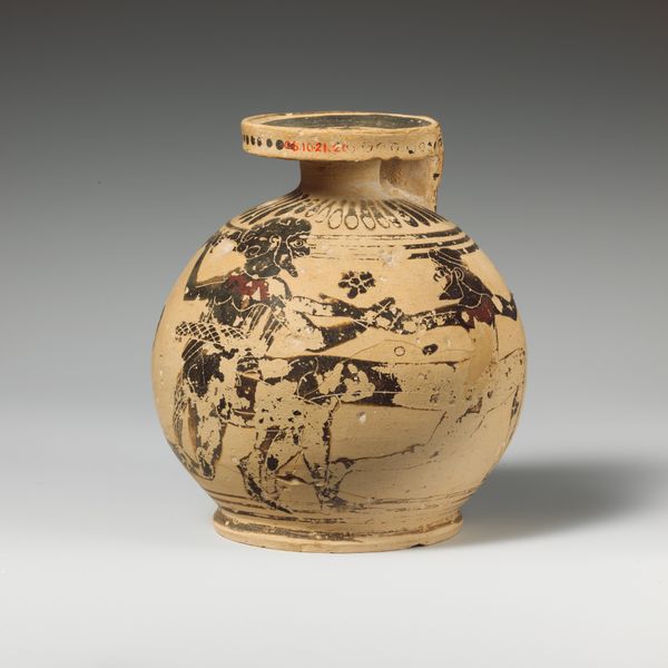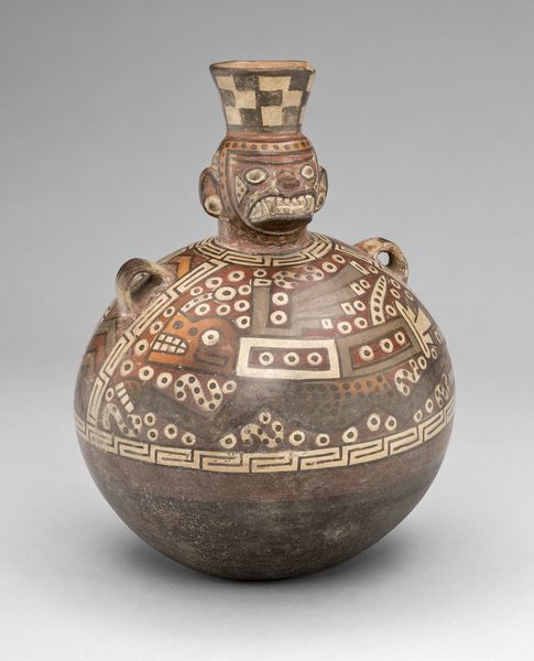 Editor: Here we have an example of Chimú pottery, a “Jar with Relief of Standing Figure with Crescent Headdress, Holding Ritual Objects,” likely created sometime between 1200 and 1450. Its monochromatic palette is striking. It gives the object a solemn, weighty feel. Curator: Indeed. The interplay between the raised relief and the dark, burnished ceramic is meticulously executed. Notice the geometric designs along the vessel's neck, contrasted against the more figurative imagery on the body. It's an intriguing dance of form and surface. Editor: This vessel likely served a specific social purpose. Pottery production in the Chimú culture was highly specialized; artifacts like these would have been used for elite feasting, ceremonies, or even funerary practices. It reflects the socio-political dynamics of the time. Curator: Semiotically, consider the central figure. The crescent headdress, the ritual objects they hold – perhaps a scepter or ceremonial knife – each detail signifies power and status within their hierarchical society. It communicates very clearly the visual language they used to construct authority. Editor: And let's not overlook the means of production! The clay itself, the labor involved in shaping, firing, and burnishing the piece. These ceramics testify to the mastery of materials and the complex divisions of labor within the Chimú workshops. This vessel embodies countless hours of specialized skill. Curator: Absolutely. The texture created on the background, almost stippled, amplifies the dimensionality and draws attention to the meticulously carved relief figure. Each groove and contour catches light in a distinct way, animating the character within the composition. Editor: Considering the grand scale of the Chimú empire, which was built on resource extraction and agricultural surpluses, we can even think about this jar as a reflection of this material wealth. It’s luxury transformed into ritual and art. Curator: The way the artist skillfully blended geometric abstraction with representational form is masterful. It encourages an interpretation beyond its functional role, pointing toward symbolic and aesthetic ambitions. Editor: For me, knowing something about where this jar comes from connects me to the material realities and skills necessary to its production. Curator: Yes, by closely examining these shapes, motifs, and textures, one gains insight into the nuanced visual vocabulary of a people and time so vastly different from our own.