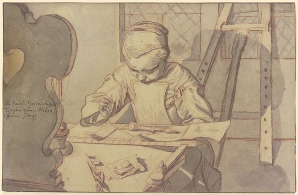 This pen and watercolor drawing presents a scene of focused industry; a man writing at a long table. The sketch likely comes from sixteenth-century Europe, a time when the rise of literacy, the print revolution, and new forms of bureaucracy were transforming society. The act of writing, once confined to religious and aristocratic elites, became increasingly common among merchants, professionals, and even some artisans. The image creates meaning through its intimate portrayal of a private, domestic interior. The man’s clothing indicates that he is most likely a member of the emergent middle class. The room's furnishings, while not lavish, suggest a degree of comfort and stability. It offers a glimpse into the spaces where knowledge was produced and disseminated. The composition draws attention to the tools of writing, such as the inkwell, quill, and stacks of paper. To fully understand the drawing, one would need to consult a range of historical sources, including studies of literacy rates, the history of the book, and the material culture of early modern Europe. Only through a consideration of such social and institutional contexts can we hope to understand its significance.