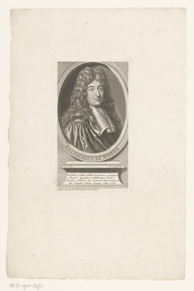Curator: Before us we have an engraving dating from 1708 to 1780, attributed to Jacob Houbraken. It’s entitled “Portrait of John Churchill, Duke of Marlborough.” It’s a classic baroque portrait. What strikes you most immediately? Editor: The intricacy, surely? Look at how those curls have been rendered! One imagines the hours of labour both in the Duke’s morning toilette and in the artist’s workshop, painstakingly incising these delicate lines into the metal plate. This piece speaks volumes about status and access. Curator: Indeed. Consider also the symbolic weight. The oval frame, often seen as a symbol of intellect and refinement, and of course the Duke’s flamboyant wig speaks of authority, almost overwhelming the actual man himself. Editor: But where did the paper come from? And who did it employ to produce these prints en masse? An image like this would only serve a very limited aristocratic demographic, of course. We shouldn’t overlook the material culture behind such seemingly high-born items. Curator: Agreed, there’s definitely a hidden history of labor embedded in this seemingly straightforward portrait of power. What stories might it tell? His stance, perhaps deliberately nonchalant, seems intended to communicate not merely status, but a very cultivated world-weariness. Editor: It's also interesting to me to consider the original plate after its lifetime of reproductions; that would tell even further story. Curator: You're right; considering the journey this image has undertaken through material and cultural transformations opens so much to contemplate. Editor: Definitely something to remember. Curator: Agreed! Let’s move on to our next work.