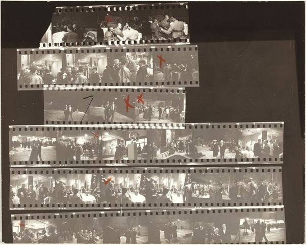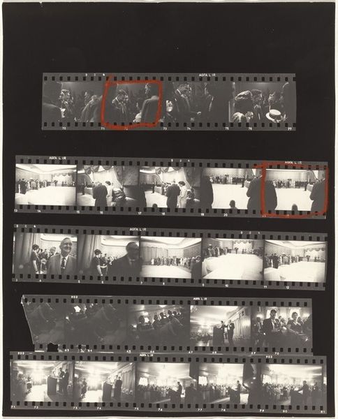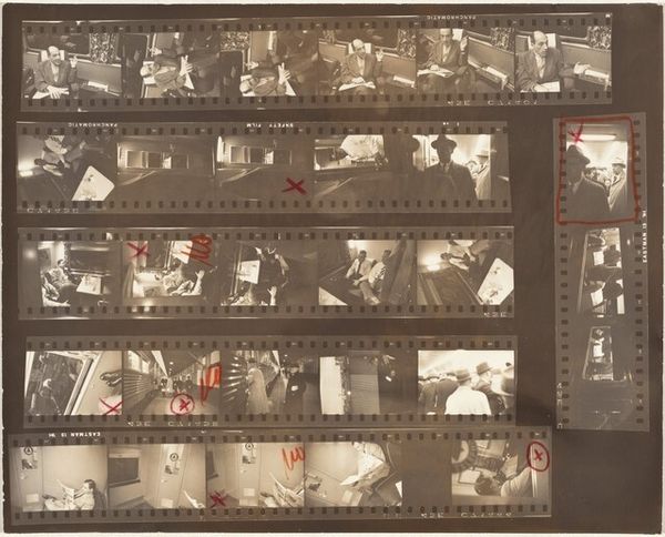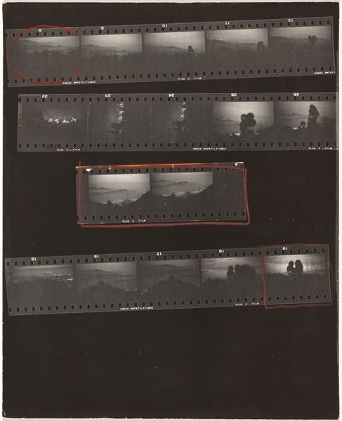 Curator: Venice, Italy 29, a gelatin silver print from 1964 by Robert Frank, presents such an intriguing, almost tactile, quality due to its form as a photographer’s contact sheet. What strikes you about it? Editor: I find the presentation as the artist’s contact sheet incredibly interesting. I’m immediately drawn to the materiality of the film strip and the rough edges. How do you interpret Frank’s choice to display these negatives as the final piece? Curator: It directs our attention to the labor and the mechanical process behind the photographic image. This isn't a carefully polished presentation, it shows us the means of production. We see the indexical traces – the frame numbers, the sprocket holes, the density variations. It invites us to consider the context of the photographer's darkroom labor as part of the work. Think about what this contact sheet tells us about Frank's method - his decisions, editing process, the very selection of images to print, and, even more intriguingly, what those images were initially captured for. Does this choice seem like an embrace or critique of consumer culture in some way? Editor: That's fascinating. It feels almost like an unedited stream of consciousness; a challenge to traditional notions of artistic perfection. The material of the contact sheet really emphasizes that Frank had to pick and choose – it was a deliberate act of labor to edit. Do you think this reflects his feelings about industrialization and the increasing ease of producing images, the impact of images that flood our society, at the time? Curator: Precisely. He's using the inherent qualities of the photographic medium to reveal a deeper layer of meaning, challenging the separation of art and process. We see the image, but are constantly reminded how that image was extracted out from the continuous possibilities afforded by modern industrialized imaging technologies. Editor: I see, this is all fascinating. I never would have considered the implications of this kind of presentation on the overall statement made by this piece of art. Thank you!