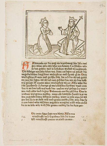 Curator: Looking at this small but mighty print, "The Annunciation," made by an anonymous artist, I'm struck by its immediate intimacy. Don't you just feel drawn into that quiet, monumental moment? Editor: Intimate, yes, but also incredibly worked. You can see the labour in each carved line—the pressure of the tool biting into the wood, the density of the black ink against the pale paper. It's a testament to the material process and the skilled hands involved. Curator: Absolutely. And notice how the artist, despite the limitations of the medium, conveys such profound emotion. The delicate lines capture the tender exchange between the angel Gabriel and the Virgin Mary. Editor: Agreed. It's important to remember that prints like these weren't just art objects. They were mass-produced, relatively speaking, making religious narratives accessible to a wider audience. Think of the consumption, the distribution networks that facilitated this image. Curator: It's a powerful reminder of art's role in shaping belief. The raw simplicity of the woodcut lends it an almost primal spiritual energy. Editor: Precisely. It brings art closer to the everyday. It’s about making art accessible, usable, and ultimately, part of a broader cultural fabric. Curator: Well, that’s a perspective that makes me reconsider the piece entirely, considering all the dimensions of its existence. Editor: Hopefully a richer engagement with a simple, yet effective work.