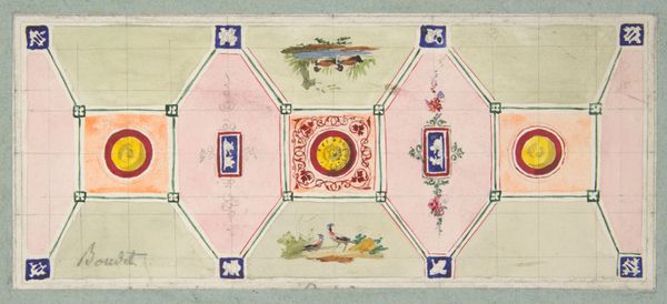 Editor: This is "Design for wall panels decorated with Chinoiserie scenes" dating from sometime between 1850 and 1900 by Jules-Edmond-Charles Lachaise. It’s a print and watercolor drawing held at the Metropolitan Museum of Art. The scenes appear dreamlike. What can you tell me about this piece? Curator: This drawing reflects the 19th-century European fascination with Asian aesthetics, a phenomenon we call "Chinoiserie." It's interesting to consider how this idealized vision of Asia served a specific function within Western society. What do you think it communicated to its intended audience? Editor: I suppose it offered an escape from the everyday, an exotic fantasy. Were these panels actually used in homes, and what does that tell us? Curator: Exactly. They were indeed used in homes, primarily among wealthier classes. These decorative arts served to signify worldly knowledge, refined taste, and social status. But consider also the power dynamics involved. Editor: How so? Curator: The artists, often European, were interpreting and reimagining Asian cultures, sometimes without a deep understanding. This is a form of cultural appropriation, isn’t it? By placing these scenes within the domestic sphere, they subtly reinforced colonial narratives of the East as a place of leisure and fantasy, ready to be consumed by the West. Editor: That's a perspective I hadn’t fully considered. So, the beauty is intertwined with a complex history of cultural exchange and power? Curator: Precisely. These panels are beautiful artifacts, but they prompt important questions about cultural representation and the social forces shaping artistic production. Editor: This really underscores the role art plays in reflecting societal attitudes. I definitely learned a lot from this dialogue!